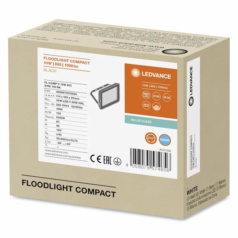 СохранитьПрожектор LED 10W/6500K ( 80W) IP65 1000Lm Свет Холодный белый Симметричный 100 Чёрный LEDVANCE FLOODLIGHT COMPACT, уп. 1шт интересное: