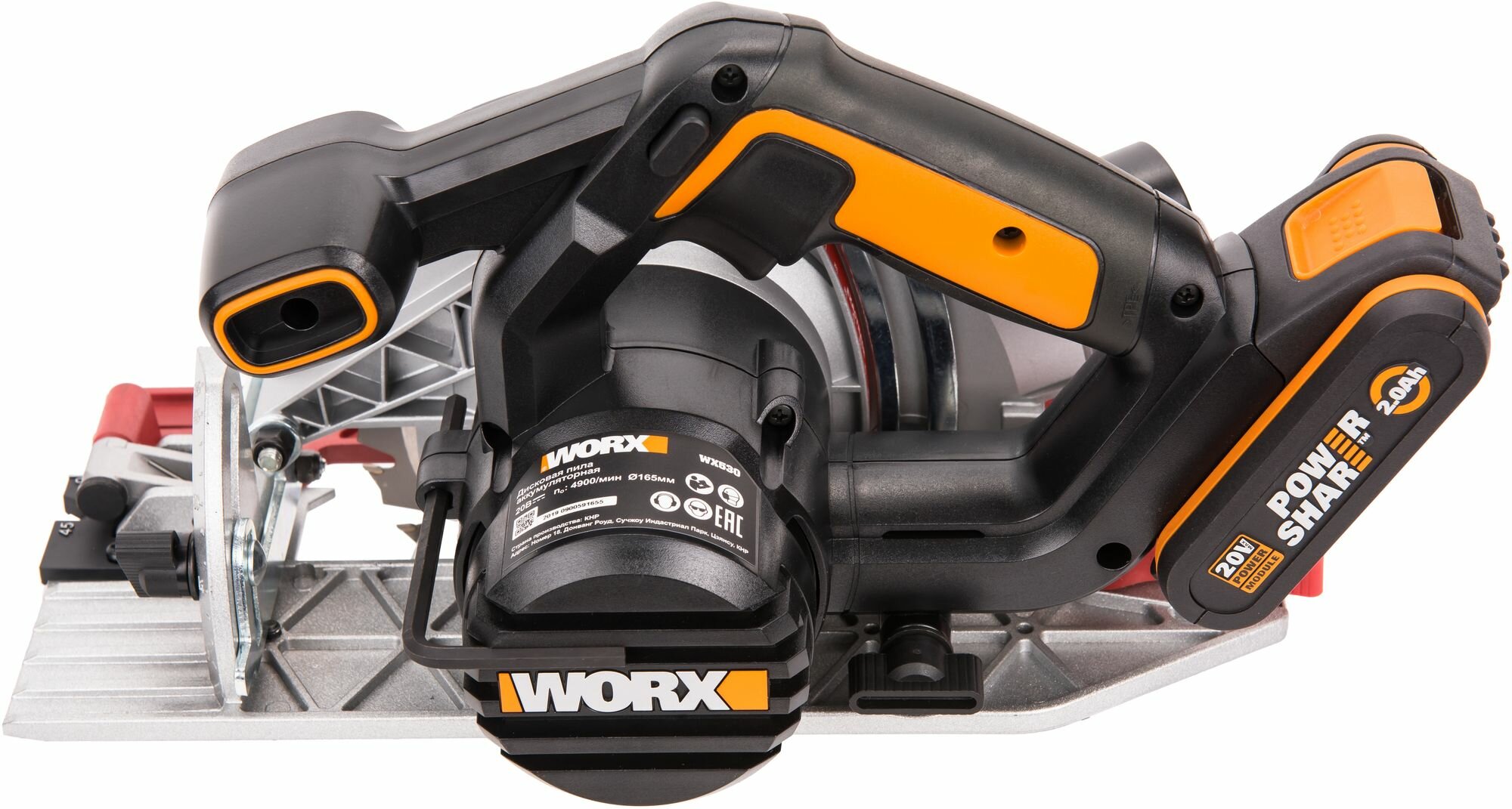 Дисковая пила аккумуляторная WORX WX530, 165 мм, 20 В, АКБ 2,0 А*ч, ЗУ 2 А, коробка