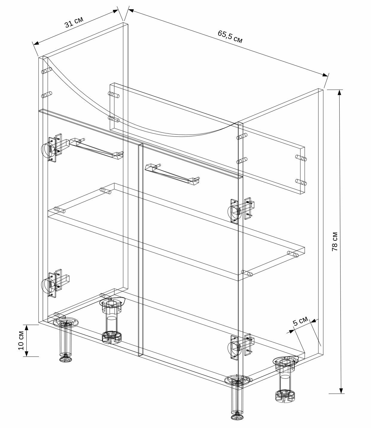| Комплектация | 2 дверцы, 1 полка, 2 ручки, 4 ножки |