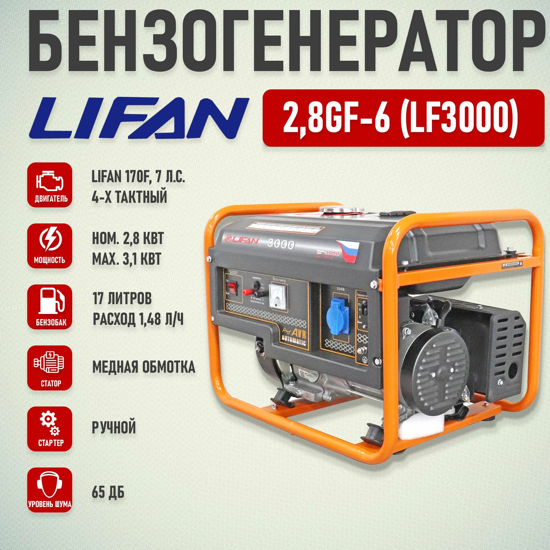 Генератор бензиновый Lifan 2.8 GF-6 (LF3000) 3кВт 220В 15л одна фаза