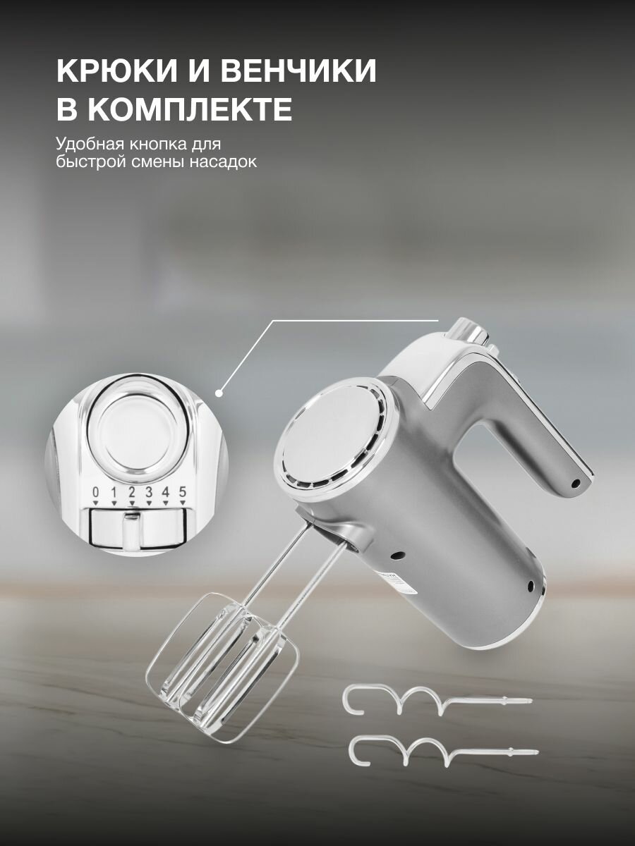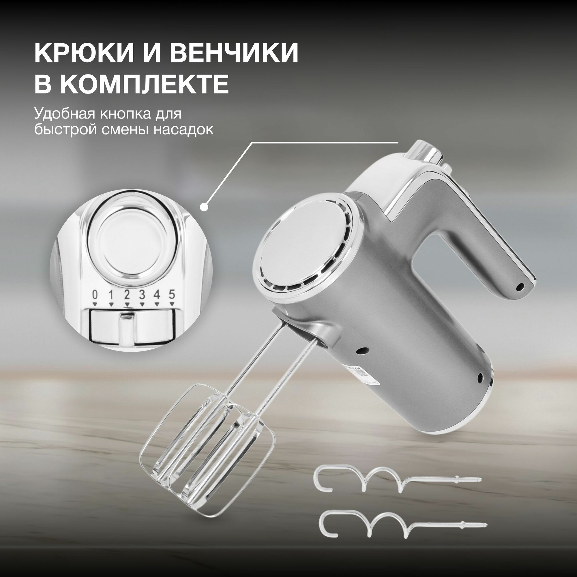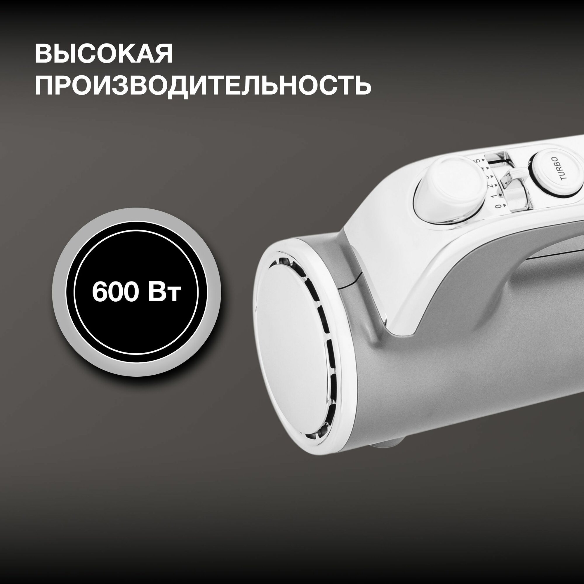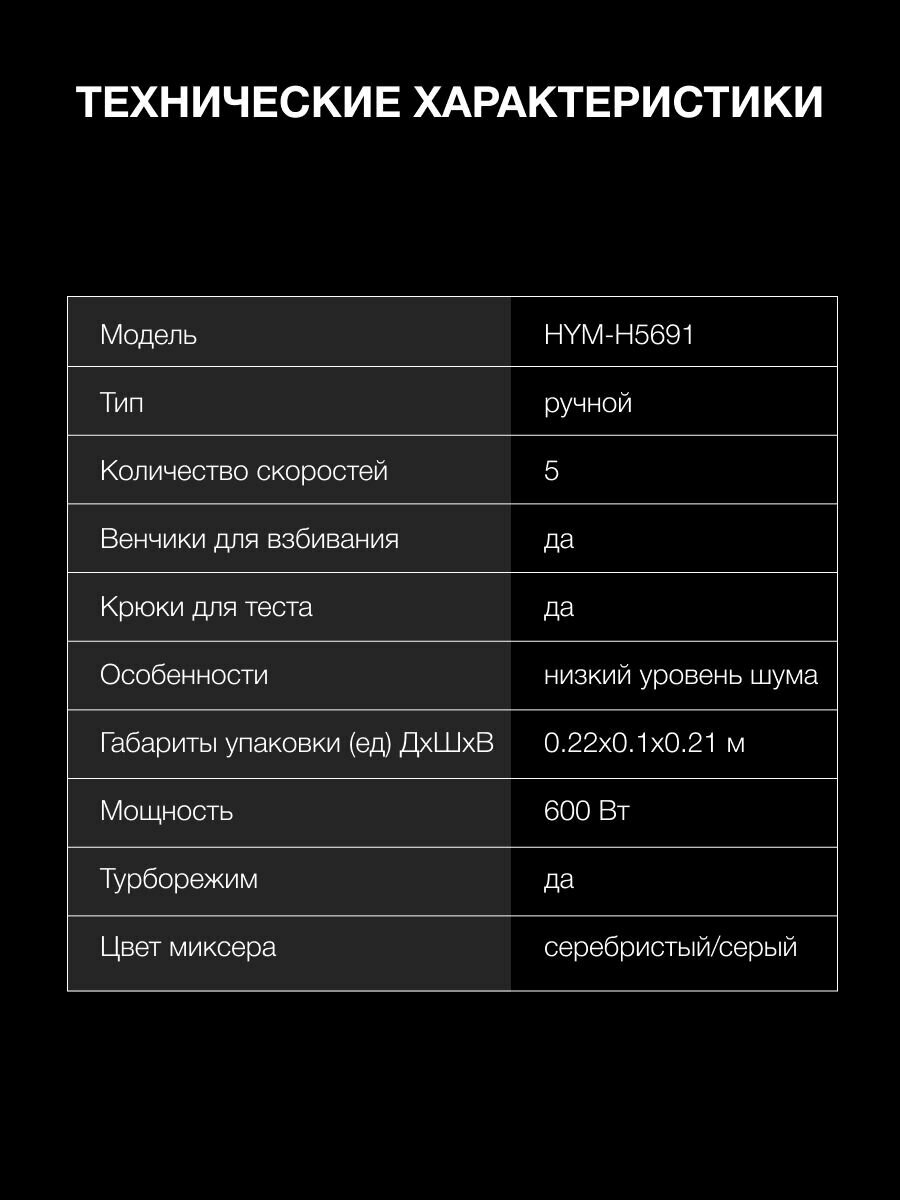 Купить Миксер ручной Hyundai HYM-H5691 серебристый, Мощность 600 Вт, 5 скоростей, TURBO-режим, 2 года гарантии