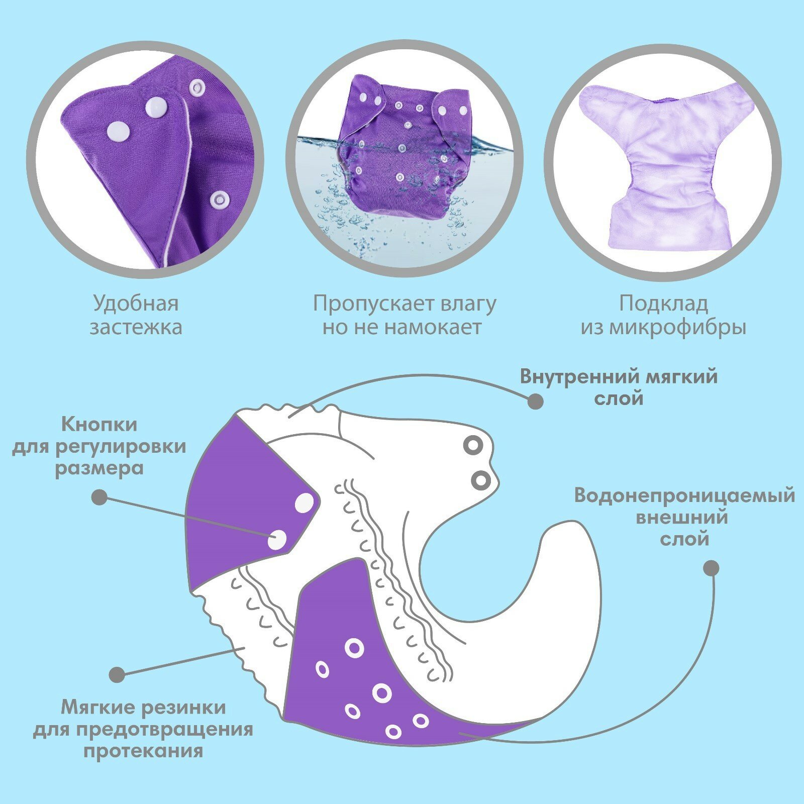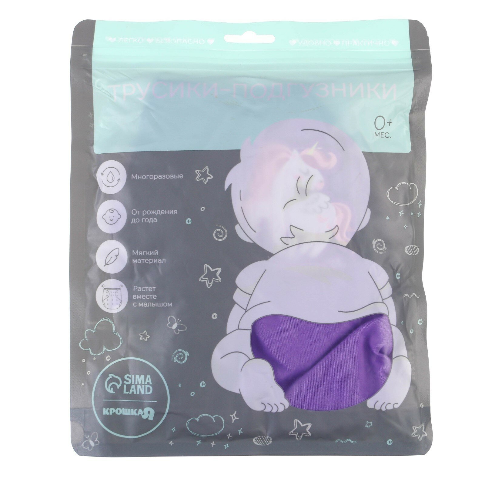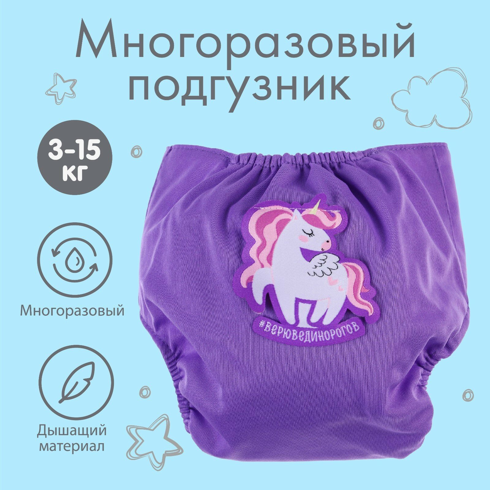 | Комплектация | Многоразовый подгузник «Верю в единорогов» цвет фиолетовый |