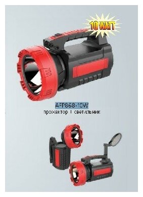 | Подробная комплектация | фонарь аккумуляторный светодиодный AFP868-10W; адаптер со шнуром и двухполюсной вилкой; плечевой ремень; руководство по эксплуатации и гарантийный талон; индивидуальная цветная упаковка |