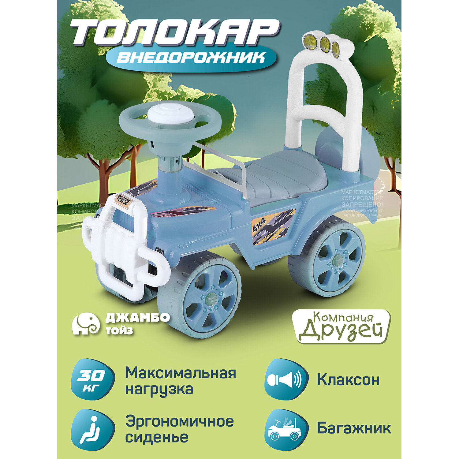 Каталка детская толокар ТМ Компания Друзей, внедорожник, джип, пушкар, пластиковые колеса, высокая спинка, багажник, голубой, JB5300681