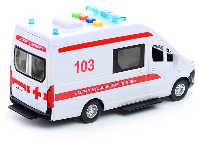 Машинка Технопарк Газель Некст Скорая помощь с носилками, 22,5 см, откр. двери, свет, звук