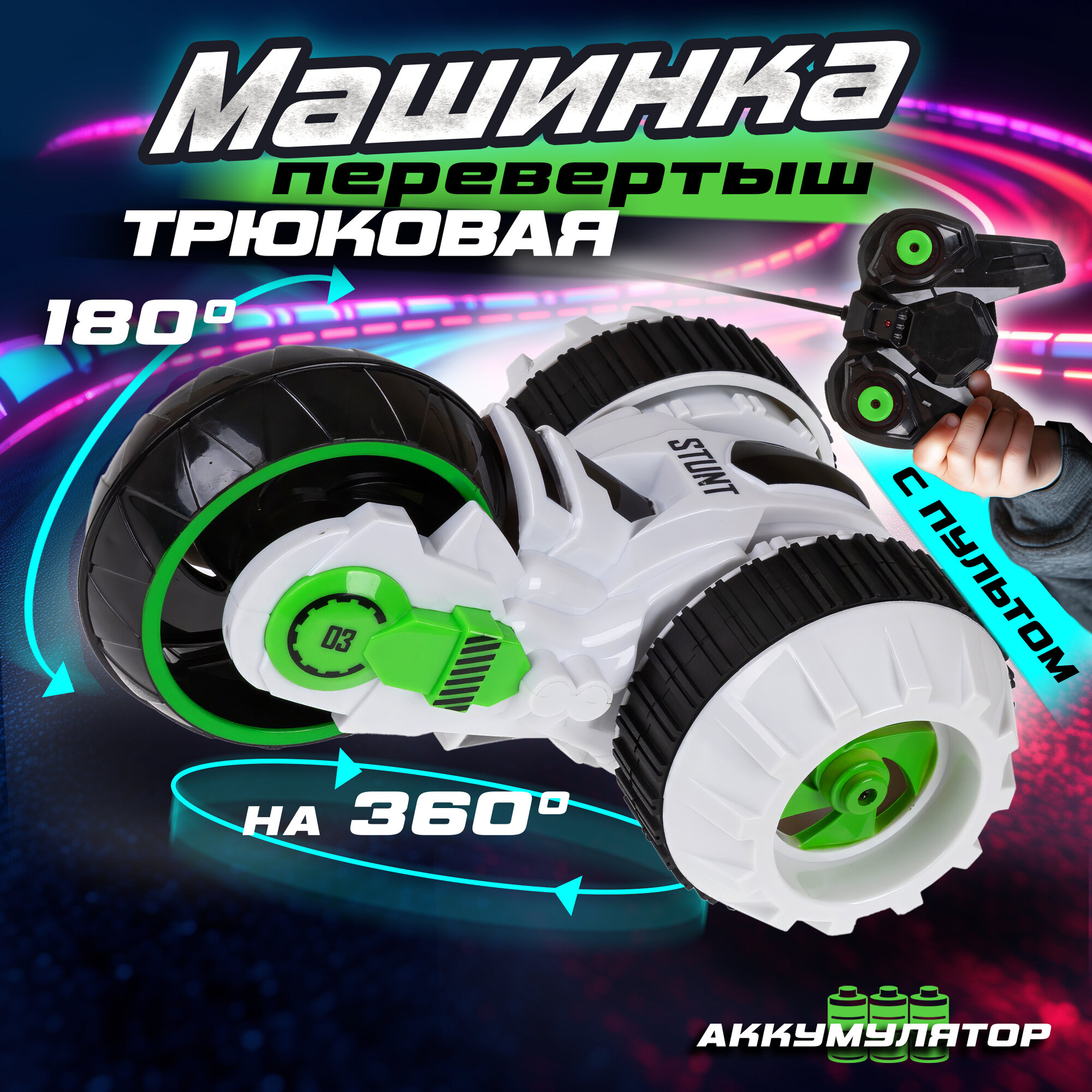 трюковая трёхколёсная машина-перевёртыш на р/у 1toy Драйв, 27MHz, вращение на 360, со светом, c Акб .