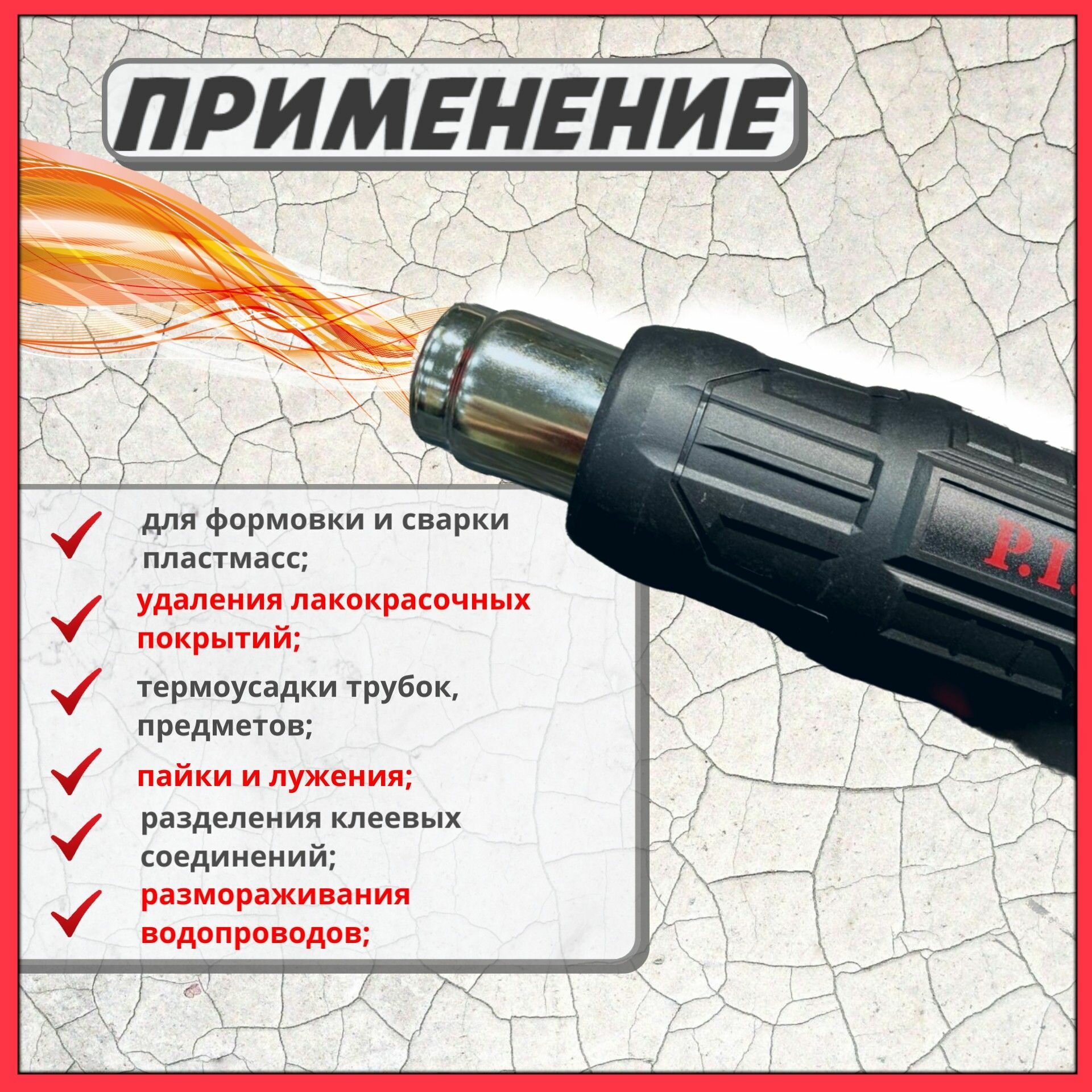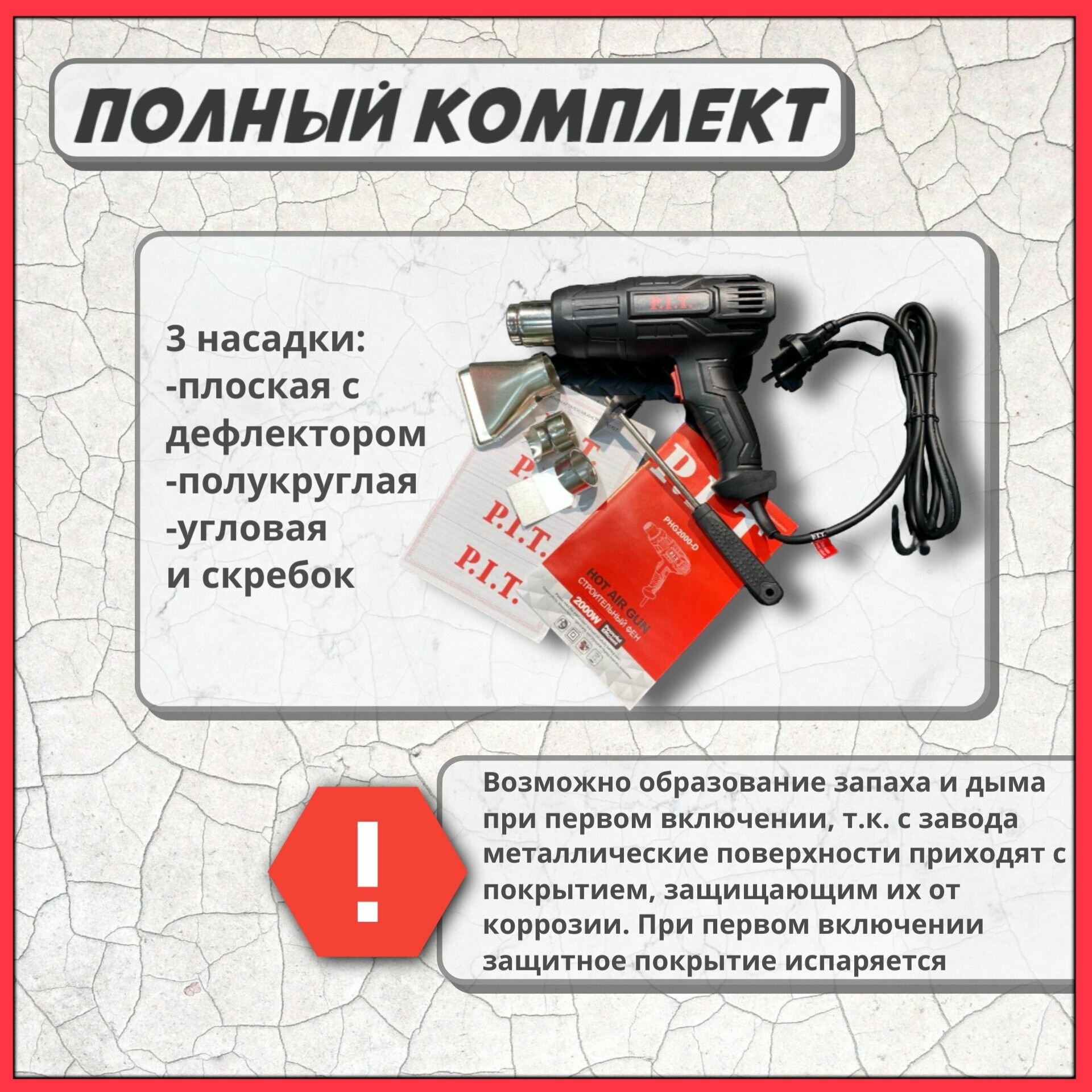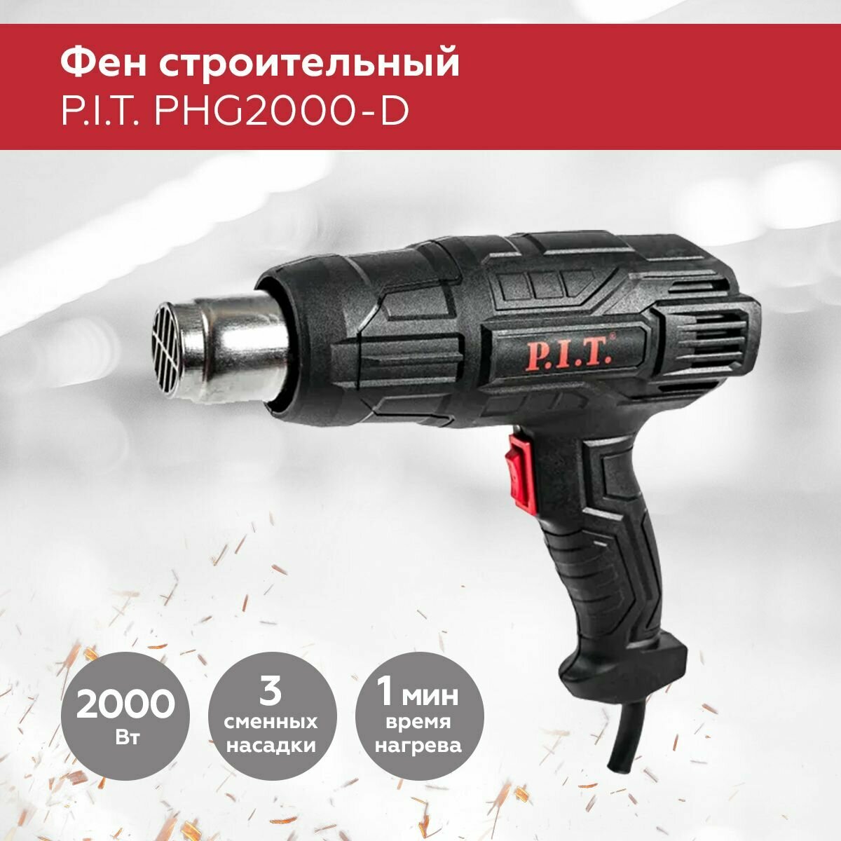 Фен P.I.T. PHG 2000-D (2кВт, 50-600*С, три положения потока воздуха, насадки)