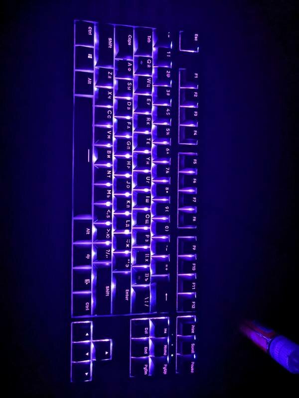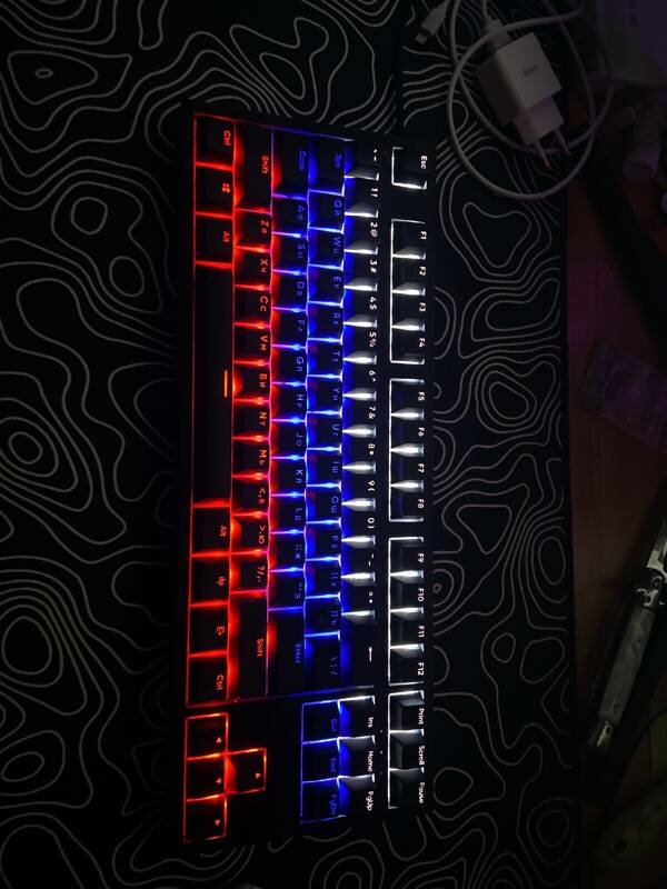 | Плюсы: | хорошая подсветка, приятные линейные жёлтые гатероны, удобный формфактор tkl, вывод провода возможен на разные стороны клавиатуры, удобный софт, смазанные стабы |