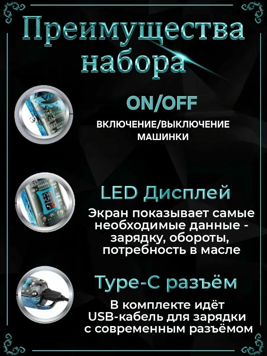 | В комплекте | защитный колпачок / кабель USB / кабель для зарядки / масло / щеточка |