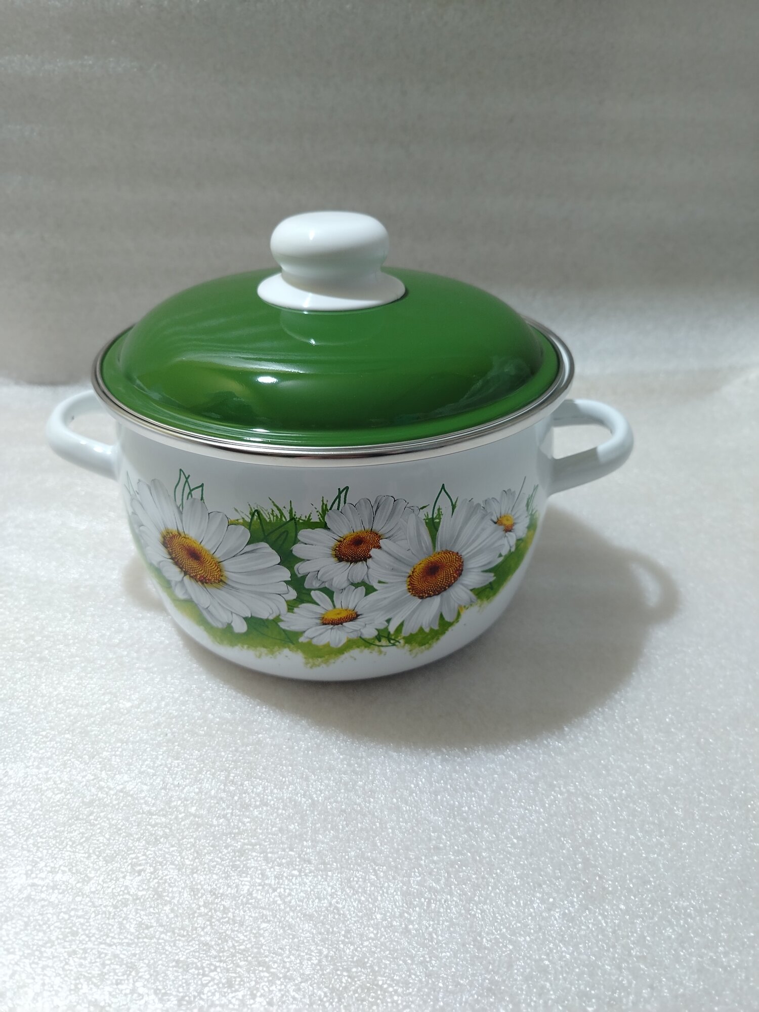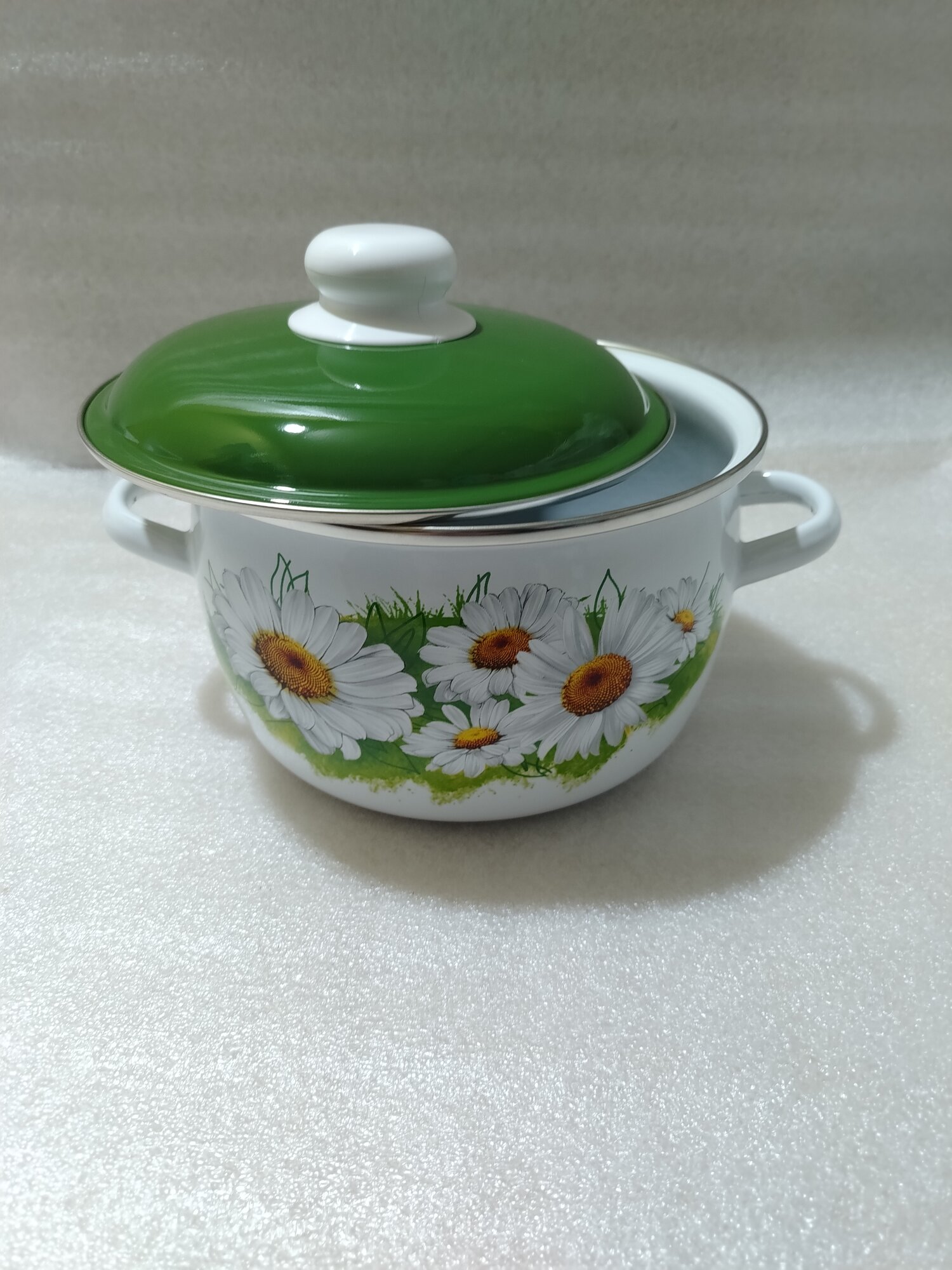"Ромашки лето" Кастрюля эмалированная 3л, сферическая форма, металлическая крышка с пластмассовой ручкой-кнопкой, ободок из нержавеющей стали, белый