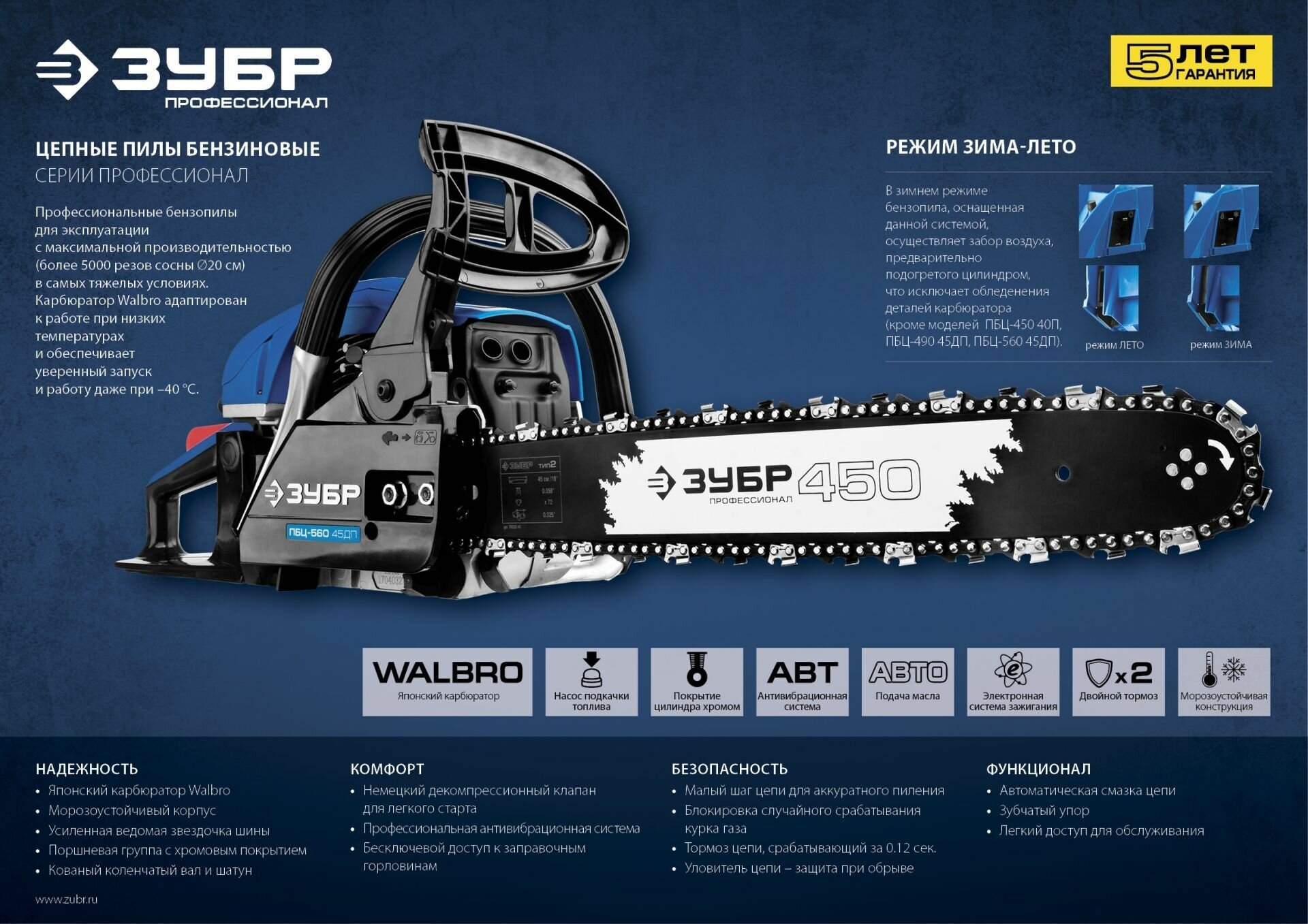 ЗУБР 45 см3, 40 см, бензопила, Профессионал (ПБЦ-450 40П)