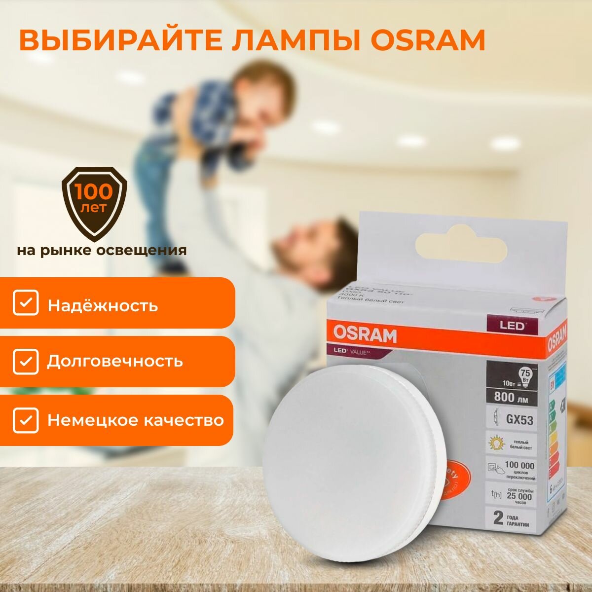 Лампочка светодиодная OSRAM Таблетка GX53 10Вт 220В 800Лм 3000К Теплый белый, упаковка 10шт