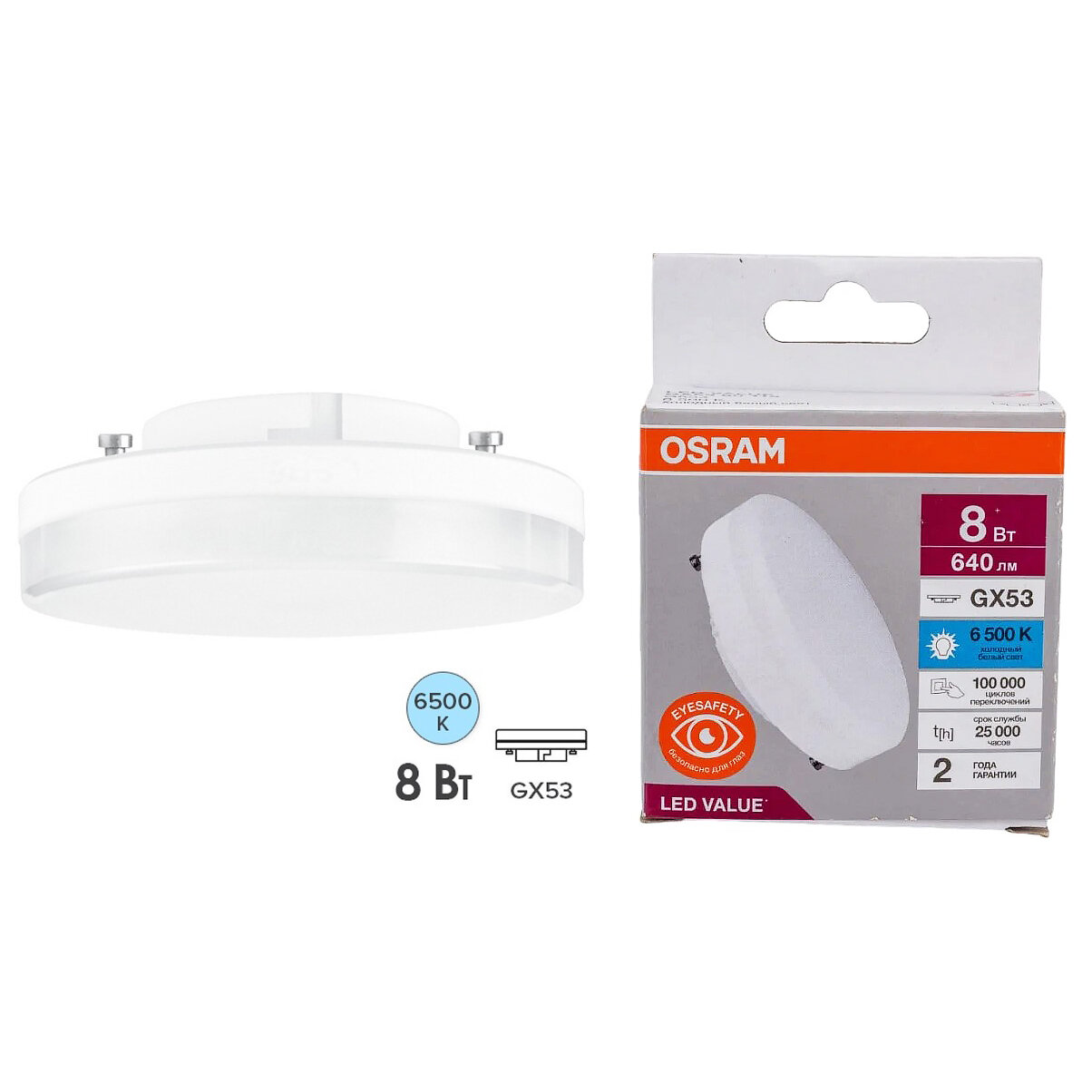 Купить 10шт/уп. Лампа LED Таблетка 8Вт 220-240V GX53 640Лм 6500К Угол 110 град. D-73mm L-28mm Свет Холодный белый OSRAM, уп. 10шт