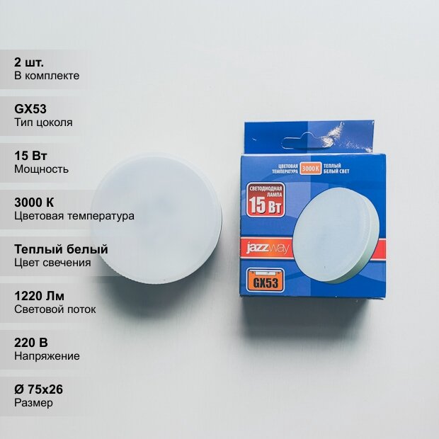Купить (2 шт.) Светодиодная лампочка Jazzway, мощность 15 Вт, напряжение питания 220 В, цветовая температура 3000 К, теплый белый свет, цоколь GX53, таблетка, размер ⌀75х26 мм