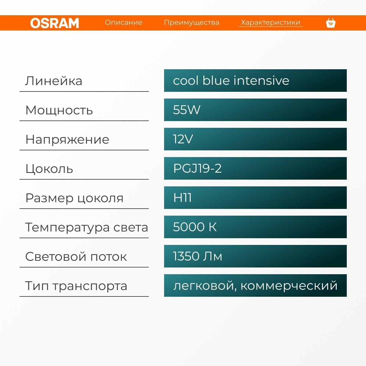 Лампа автомобильная Osram Cool Blue Intense (NextGen) H11 55W PGJ19-2+100% 5000K 12V, евробокс, 2шт