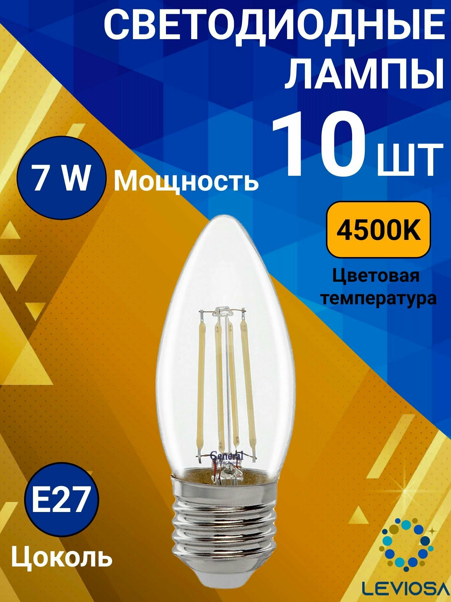 (10 шт.) Светодиодная лампочка General свеча E27 7W 4500K 4K 35x96 филамент (нитевидная), прозр. 646800 Нейтральный белый. Цоколь E27