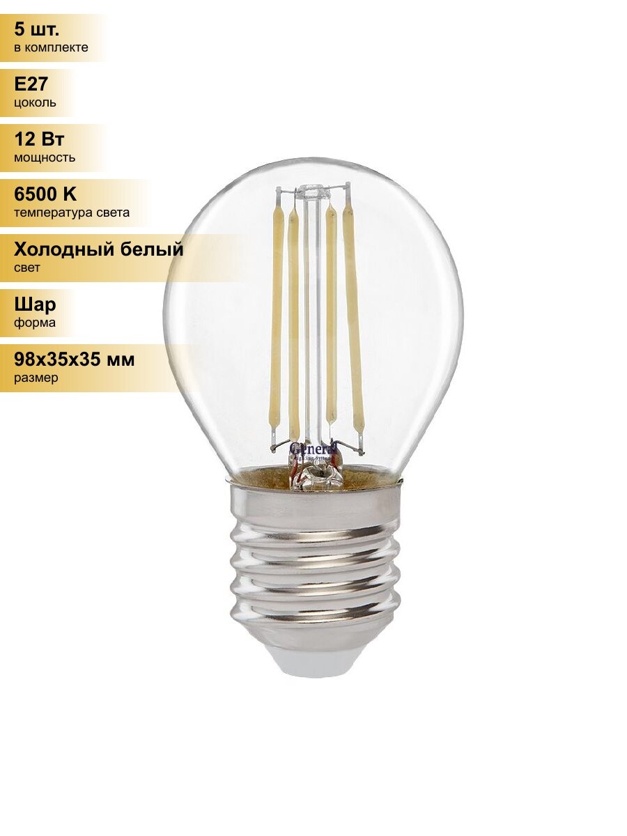 Купить (5 шт.) Светодиодная лампочка General Шар P45 E27 12W 6500K 6K 35x98 филамент (нитевидная) прозр. GLDEN-G45S-12-230-E27-6500 661013 Холодный белый. Цоколь E27
