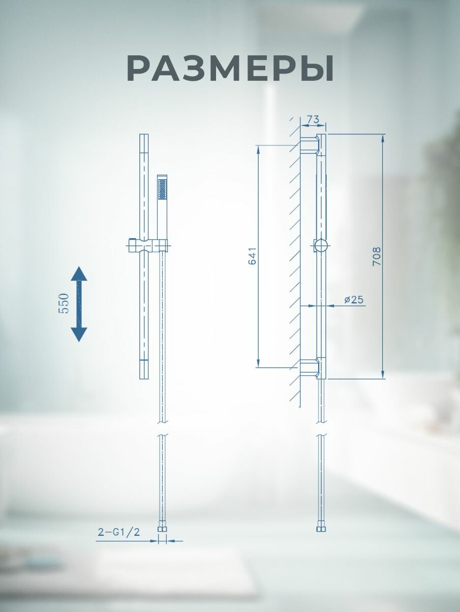 | Комплектация | душевая штанга / держатель ручного душа / ручной душ / гибкий металлический шланг / установочный комплект |