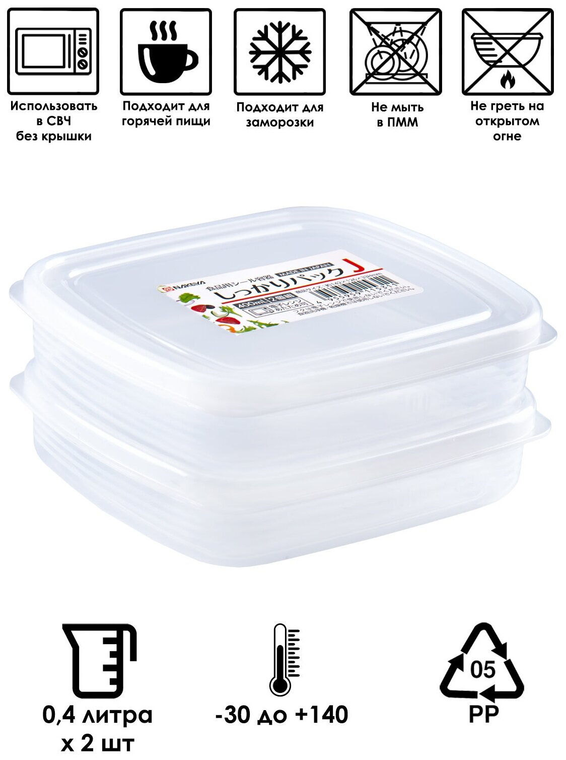 Контейнер для еды и сыпучих продуктов пластиковый с крышкой 400 мл (J), 2 шт., 14,2х12,6х3,3 см