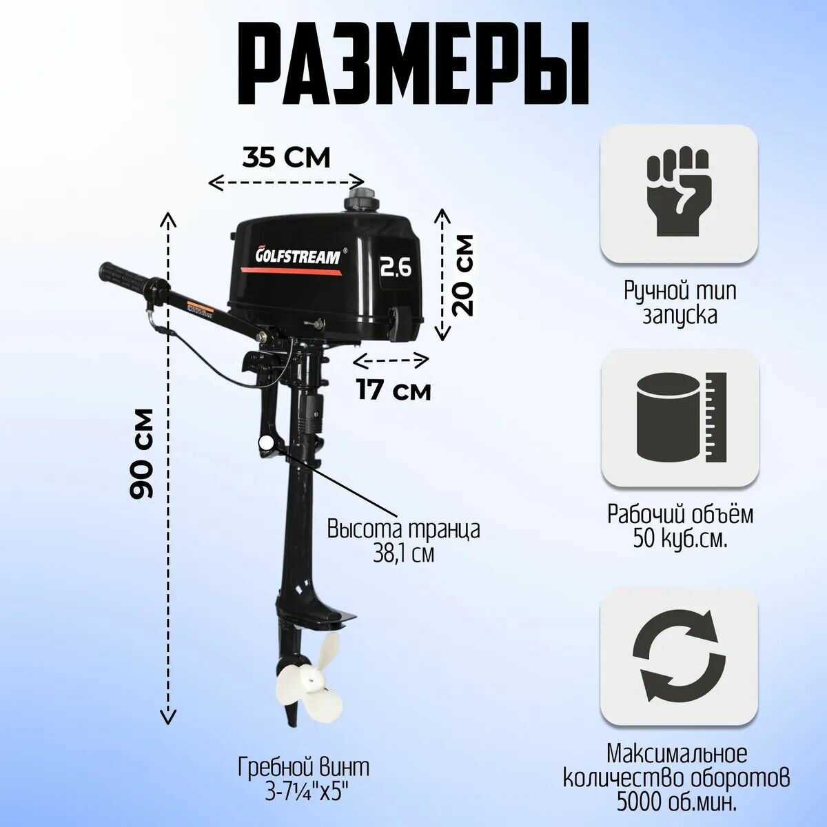 Лодочный мотор GOLFSTREAM T2.6BMS, бензиновый, 2.6 л.с., 50 куб.см, 2 тактный, 1.5 кВт