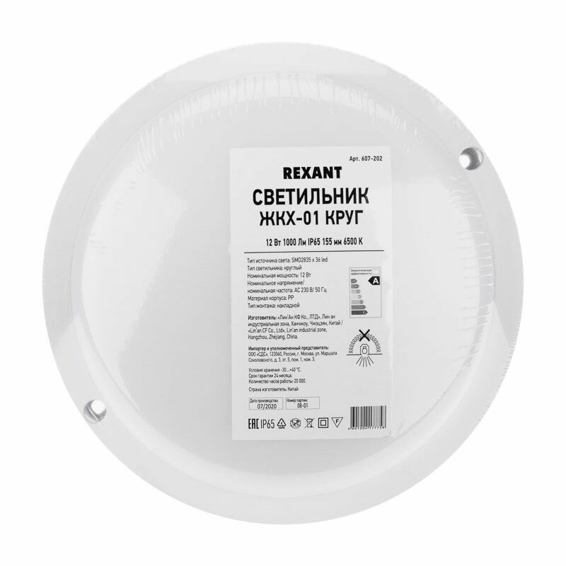 Светильник ЖКХ LED пылевлагозащищенный круг IP65 12Вт 1000Лм 6500K REXANT арт. 607-202