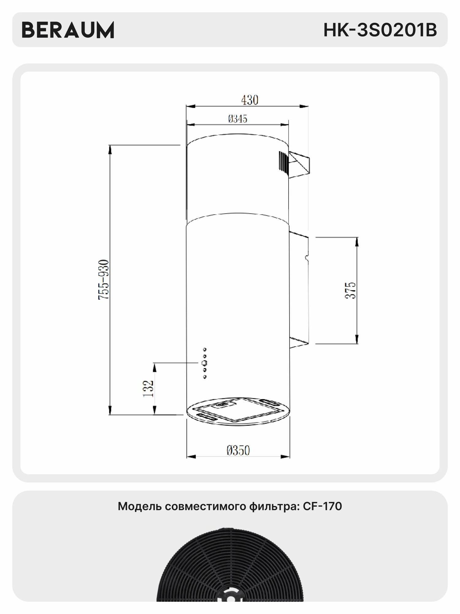 Вытяжка пристенная цилиндрическая Beraum HK-3S0201B, телескопическая интересное: