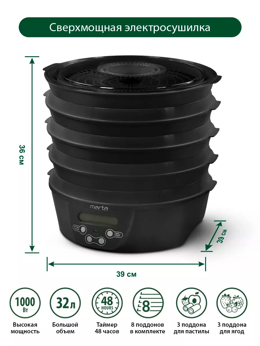 Дегидратор сушилка для овощей электросушилка MARTA MT-FD1888C 14 поддонов (8 основных + 3 для пастилы + 3 для ягод) черный интересное: