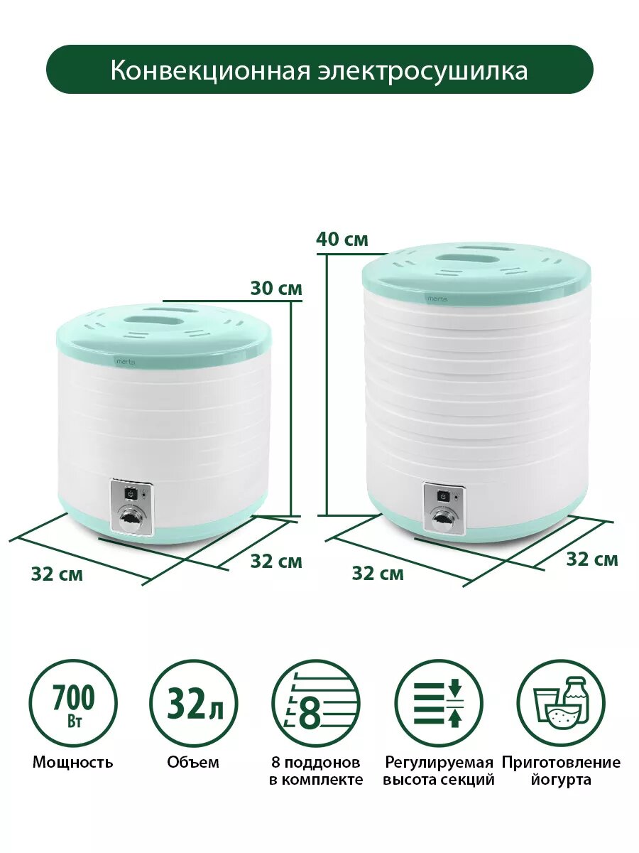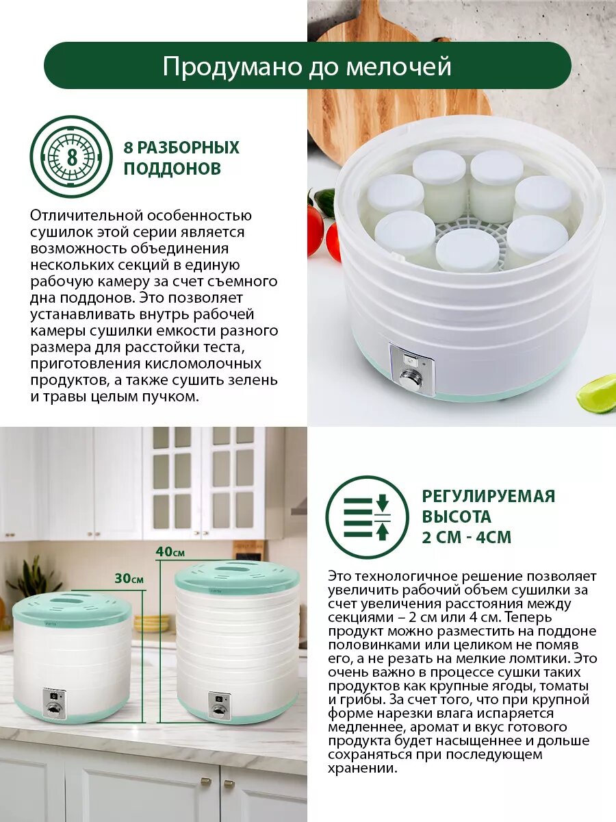 | Дополнительная информация | установка времени: 30 мин - 48 ч; диаметр поддонов: 32 см |
