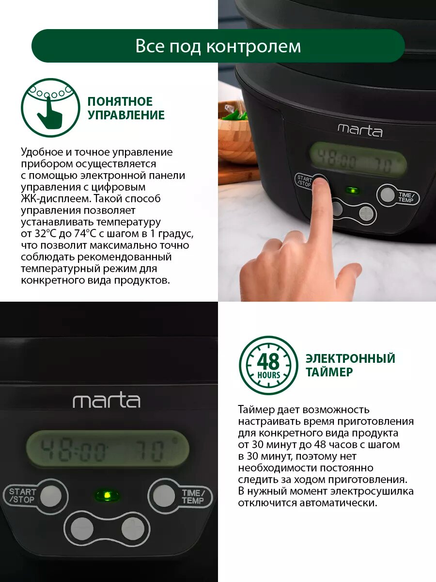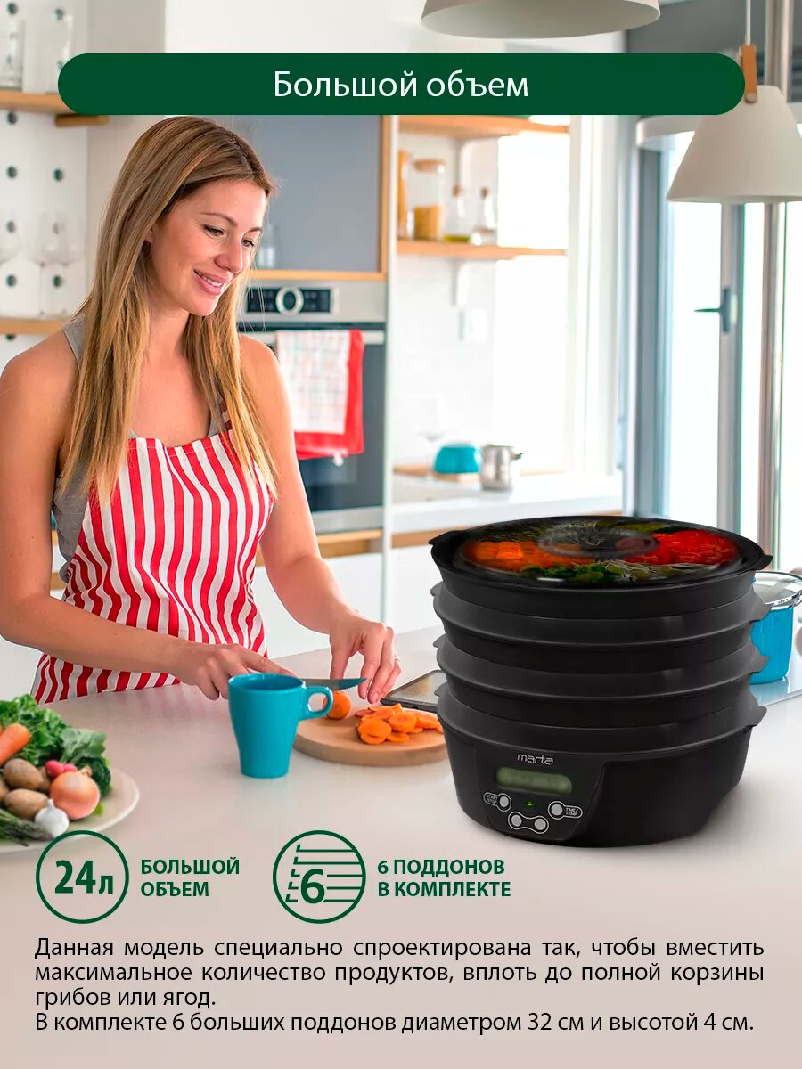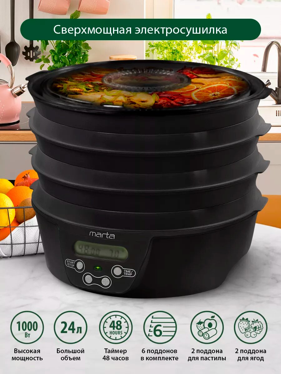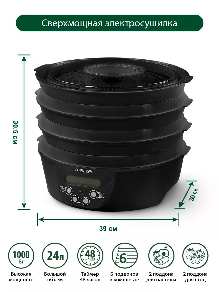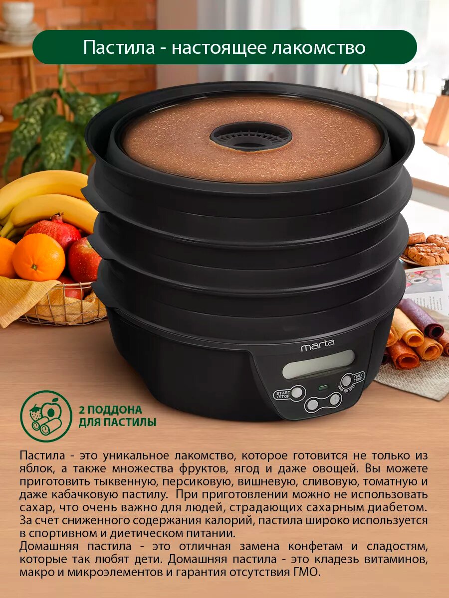 Купить Дегидратор сушилка для овощей электросушилка MARTA MT-FD1888B 10 поддонов (6 основных + 2 для пастилы + 2 для ягод) черный