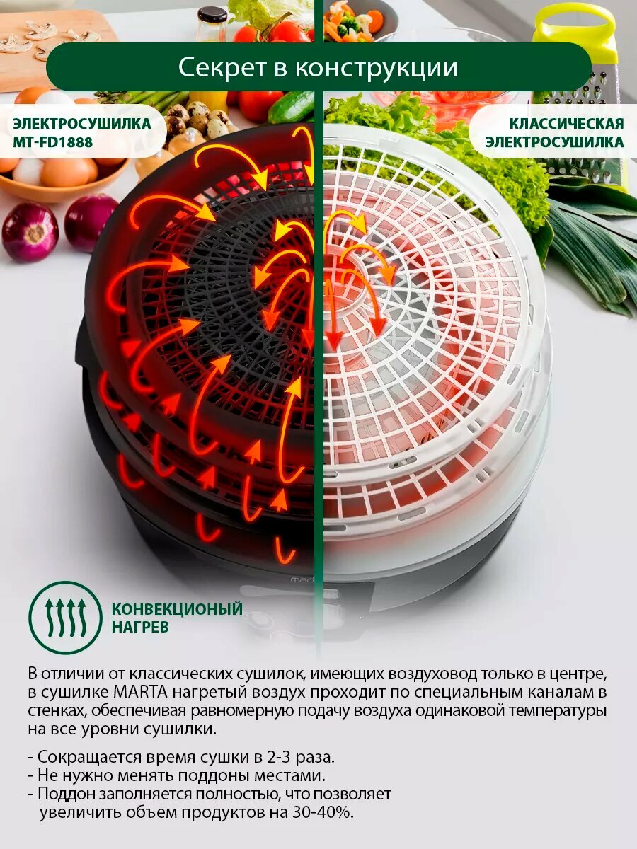 Дегидратор сушилка для овощей электросушилка MARTA MT-FD1888B 10 поддонов (6 основных + 2 для пастилы + 2 для ягод) черный интересное: