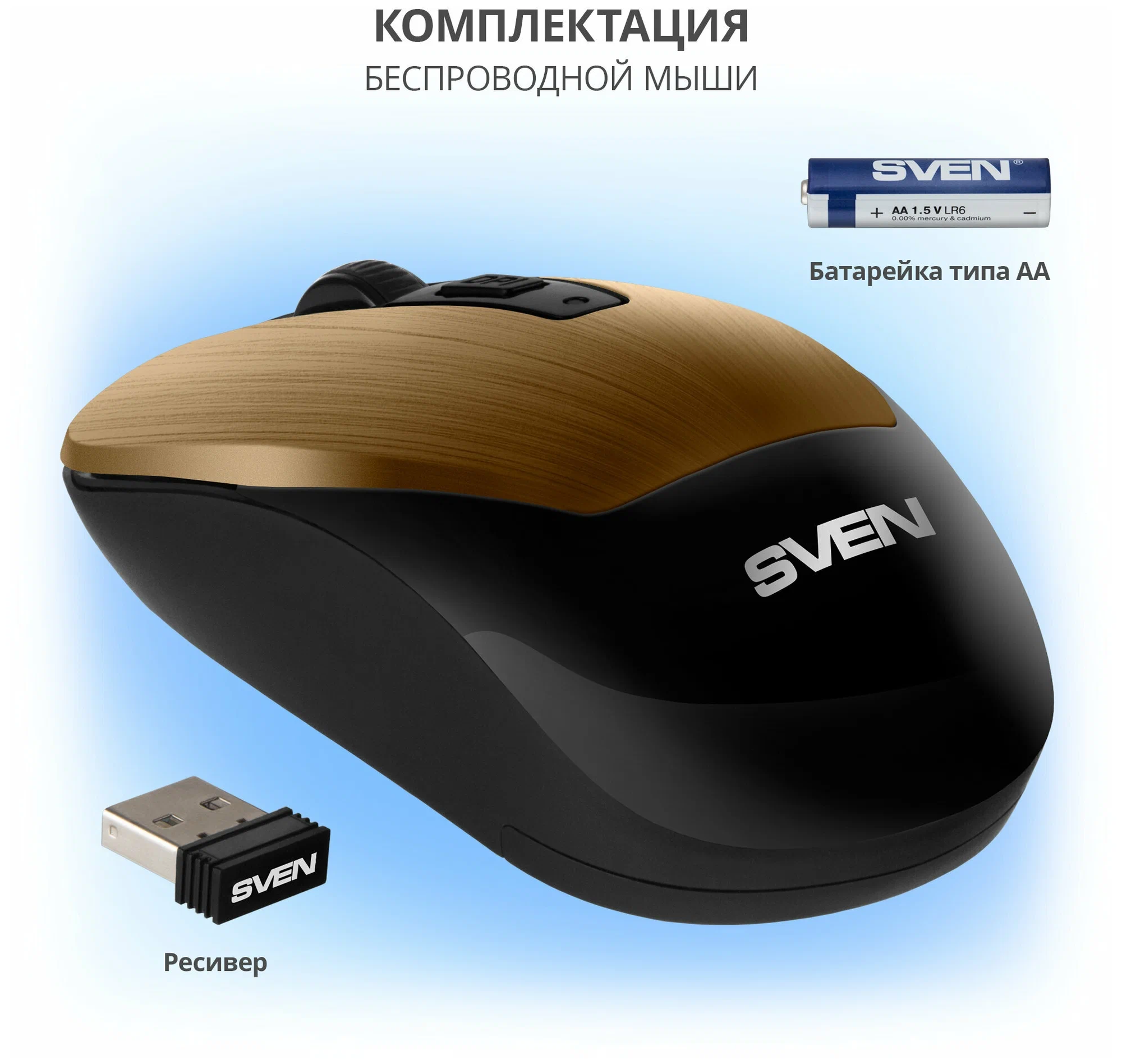 | Комплектация | беспроводная мышь SVEN RX-380W — 1 шт., 2,4 ГГц USB-приёмник — 1 шт., батарейка типа АА — 1 шт., руководство пользователя — 1 шт |