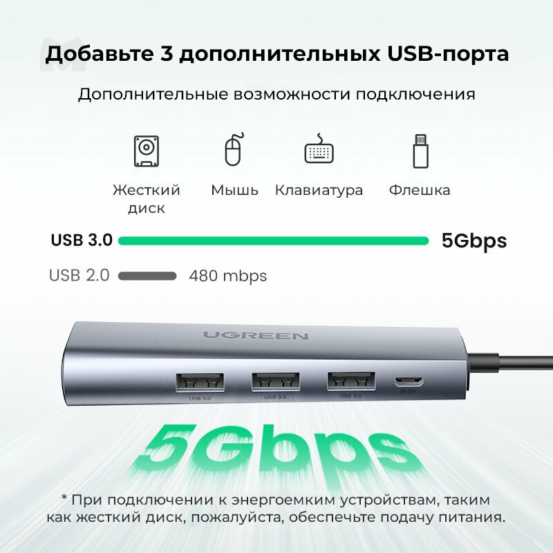 СохранитьUSB-хаб UGREEN CM266 USB-A 3.0 к 3хUSB-A 3.0, RJ45(Gigabit), порт для питания Micro USB, цвет серый (60812) интересное: