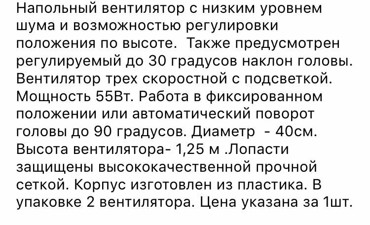 | Минусы: | Написано две штуки в комплекте, долго сомневалась, правда ли, все ли я правильно поняла. Брала за 1019, 290 была доставка, позвонили, накинули ещё 180 рублей. Ну ок, ладно. Хотя почему не написать нормально, сколько доставка будет стоить? В итоге привезли один вентилятор, просто в пакете! И зачем писать о комплекте? Просто обман на обмане. Если бы все было честно написано от и до, разумеется, взяла бы другой товар |
