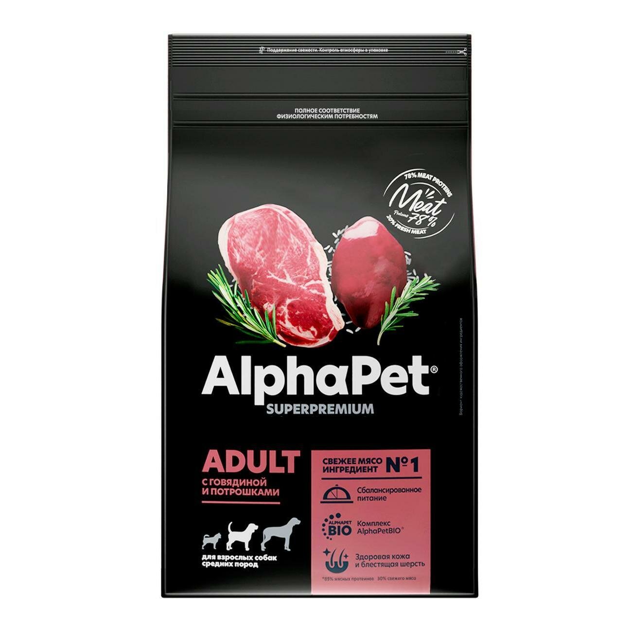 ALPHAPET SUPERPREMIUM ADULT для взрослых собак средних пород с говядиной и потрошками (12 + 12 кг)