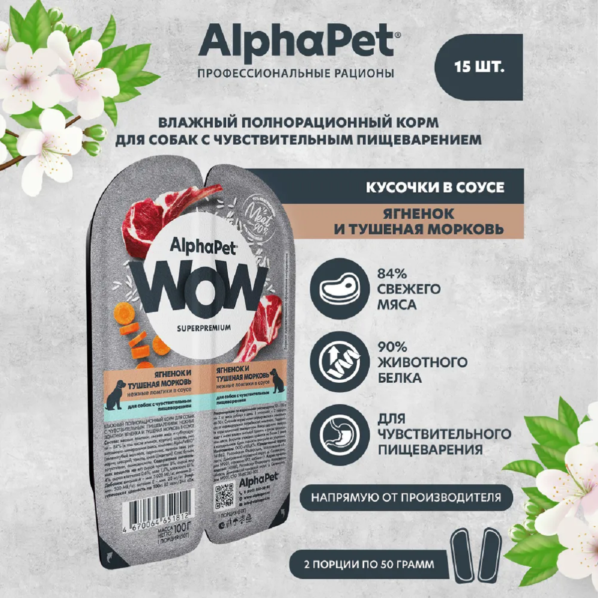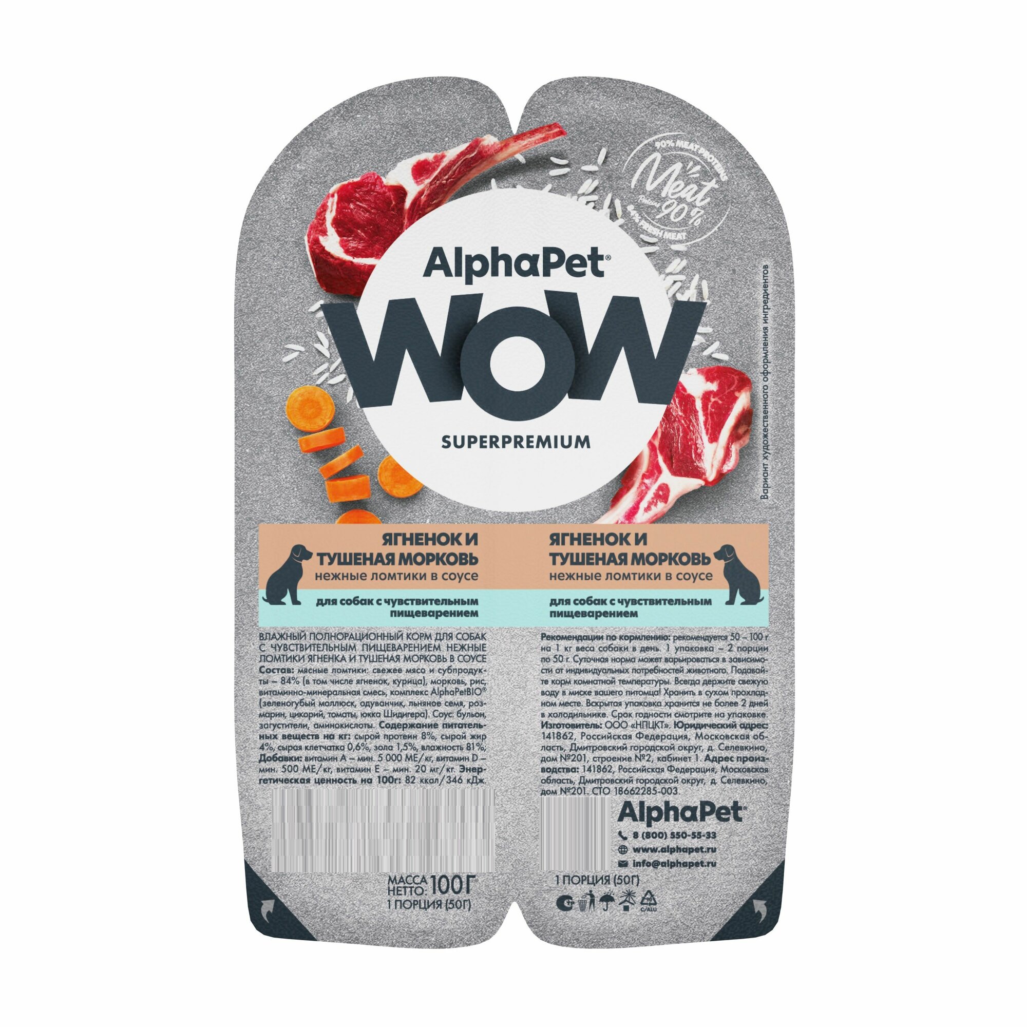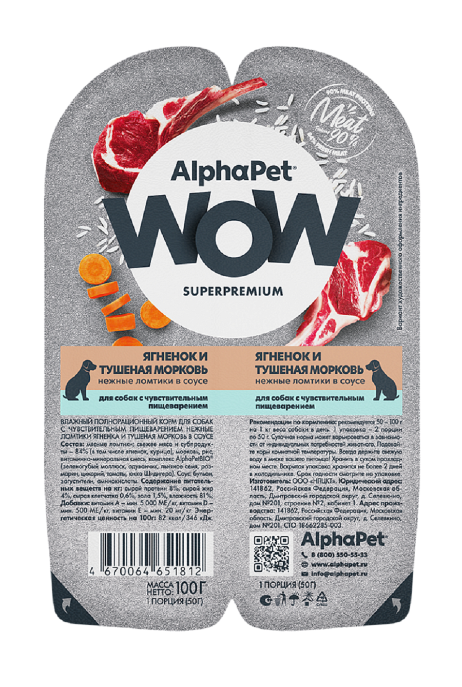 Влажный полнорационный корм холистик для собак AlphaPet WOW Superpremium/ "Ягненок и тушеная морковь нежные ломтики в соусе" 100г х 15 шт