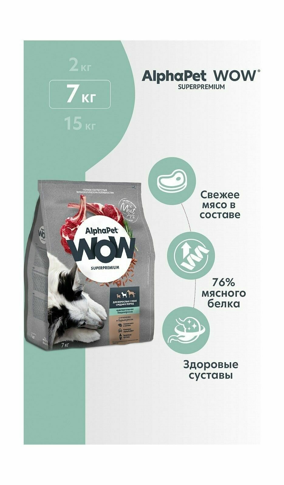 Купить AlphaPet Wow Superpremium - Сухой корм для собак средних пород с чувствительным пищеварением, с Ягненком и Бурым рисом (7 кг)