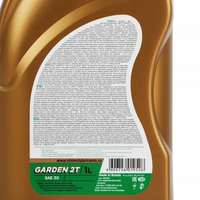 801923 Масло моторное полусинтетическое SINTEC 2T GARDEN 1л