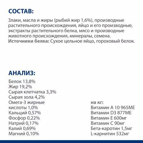 | Состав | злаки, масла и жиры, производные растительного происхождения, яйцо и его производные, экстракты растительного белка, мясо и производные животного происхождения, минералы, семена, источники протеина: сухое цельное яйцо, гороховый протеин |