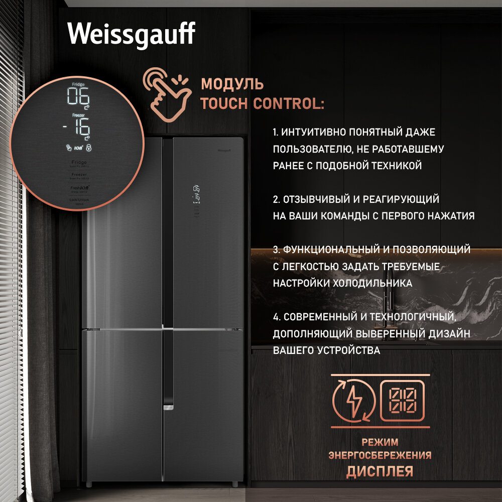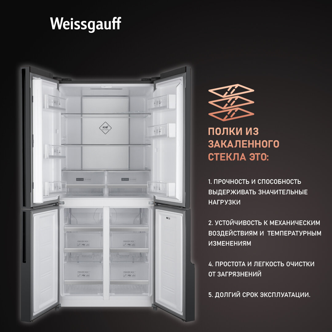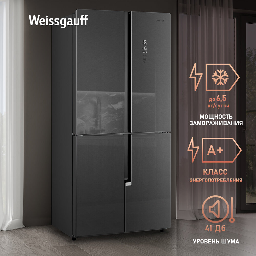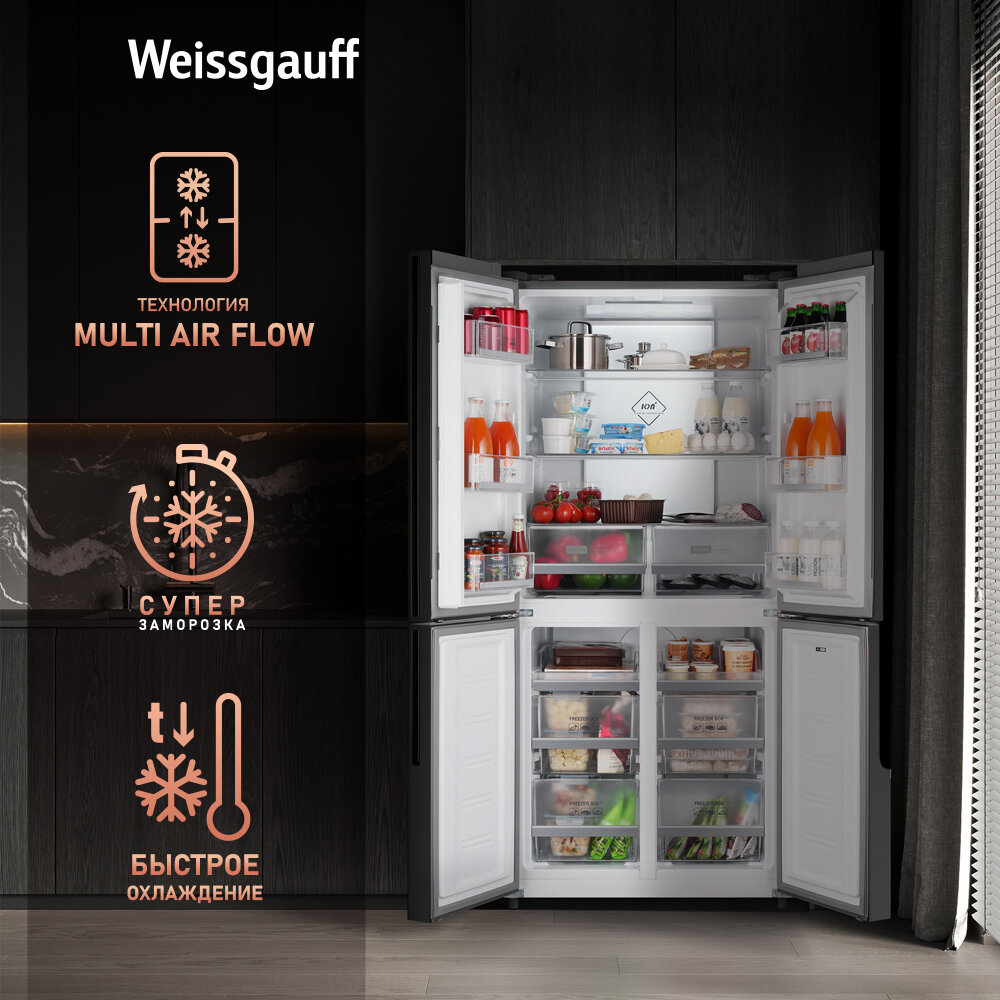 Отдельностоящий холодильник с инвертором Weissgauff WCD 450 X NoFrost Inverter четырехдверный холодильник, 3 года гарантии, система ионизации воздуха, большой объем, тихий режим, Зона свежести с контролем уровня влажности, LED-освещение
