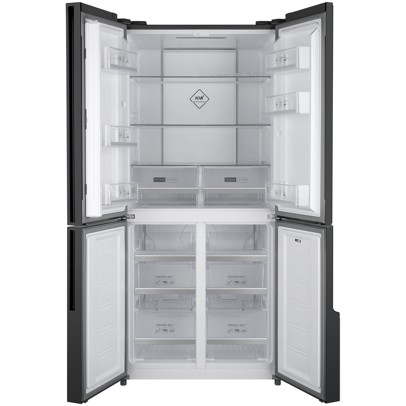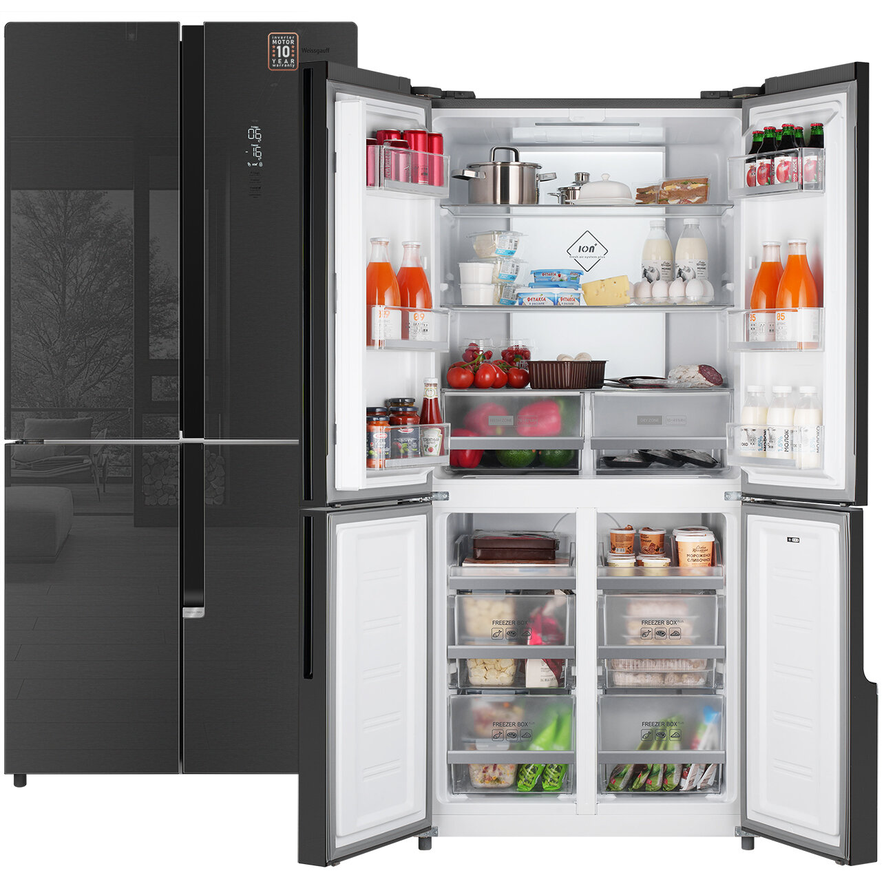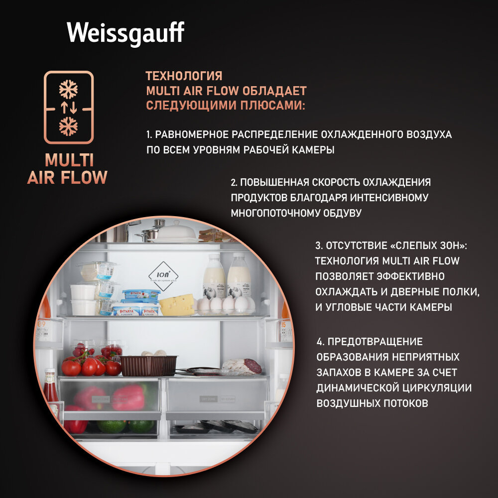 Отдельностоящий холодильник с инвертором Weissgauff WCD 450 X NoFrost Inverter четырехдверный холодильник, 3 года гарантии, система ионизации воздуха, большой объем, тихий режим, Зона свежести с контролем уровня влажности, LED-освещение