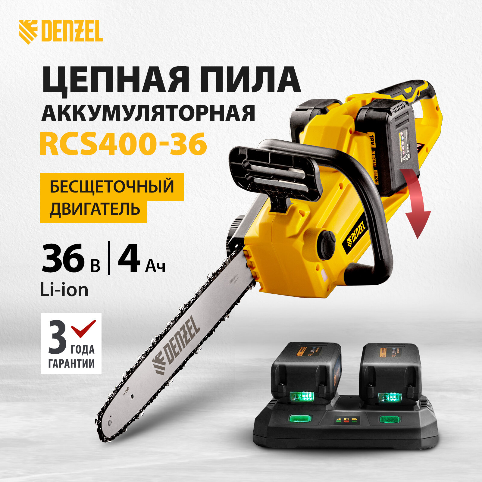 Аккумуляторная цепная пила DENZEL RCS400-36, Li-ion, 36 В, 4 Ач, шина 400 мм, бесщеточная