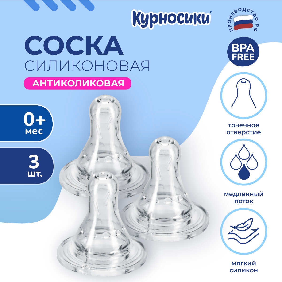 Купить Антиколиковая соска для бутылочки силиконовая Курносики классическая, медленный поток, от 0 мес, 3 шт.