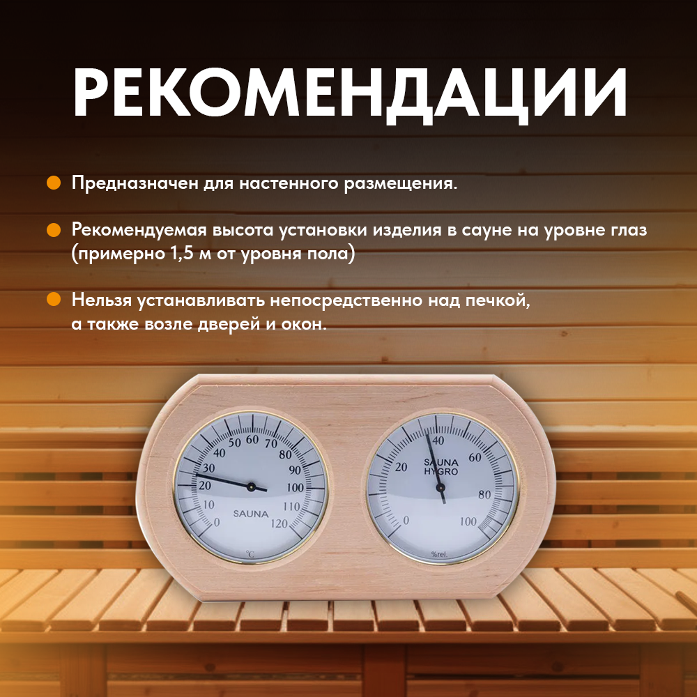 | Комплектация | Термометр для бани, гигрометр для бани |
