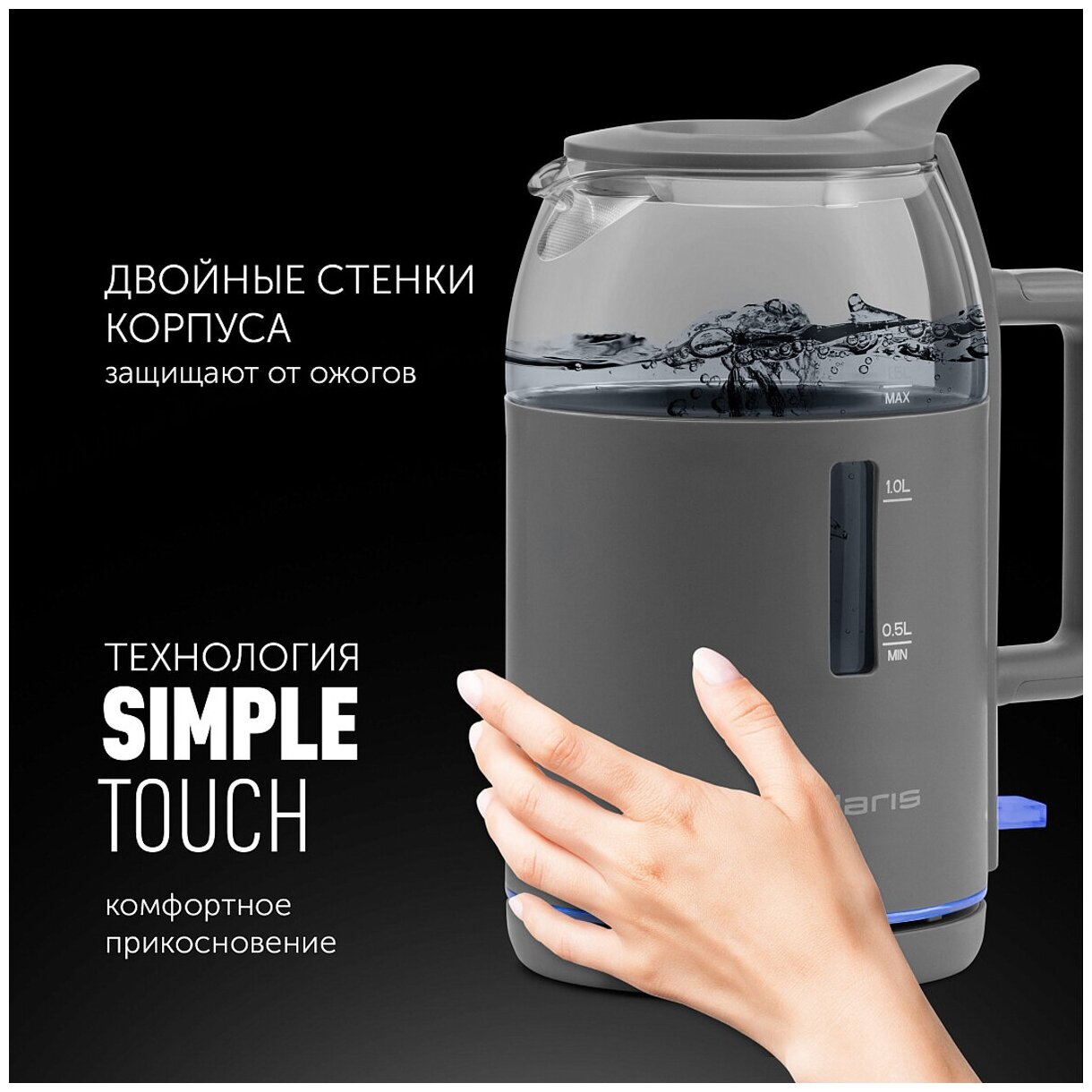 Чайник электрический Поларис PWK 1545CGL Water Way Pro изолирующий пластик/термостойкое стекло серый 1.85кВт 1.5л / техника для кухни / электрочайник