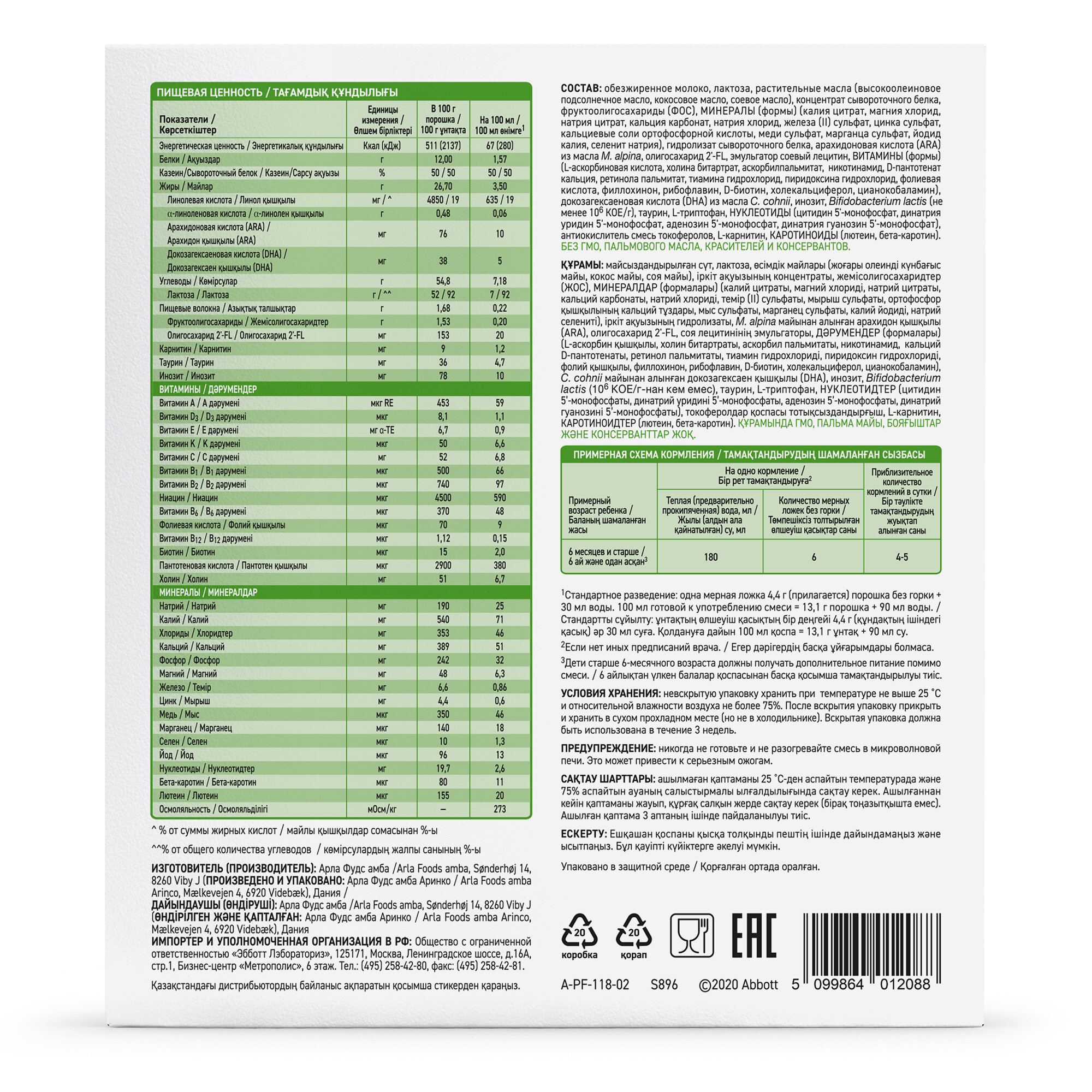 | Состав | обезжиренное молоко, лактоза, растительные масла (высокоолеиновое подсолнечное масло, соевое масло, кокосовое масло), концентрат сывороточного белка, фруктоолигосахариды (ФОС), минералы, гидролизат сывороточного белка, арахидоновая кислота (ARA) из масла M. alpina, витамины, олигосахарид 2’-FL, эмульгатор соевый лецитин, докозагексаеновая кислота (DHA) из масла C.cohnii, инозит, Bifidobacterium lactis (не менее 10⁶ КОЕ/г), таурин, L- триптофан, нуклеотиды (цитидин 5’-монофосфат, динатрия уридин 5’-монофосфат, аденозин 5’-монофосфат, динатрия гуанозин 5’-монофосфат), антиокислитель смесь токоферолов, L- карнитин, каротиноиды (лютеин, бета-каротин) |