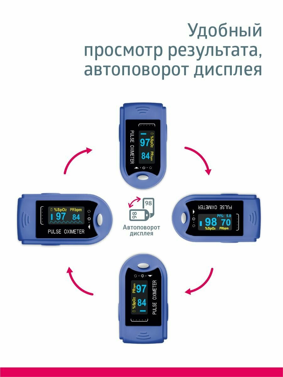 | Плюсы: | Хороший прибор, работает сразу «из коробки», только батарейки поставить, не надо ничего настраивать. Показания прибора отображаются вертикально или горизонтально в зависимости от его положения (чтобы не поворачивать голову на 90 градусов, удобно). Выключается сам после окончания измерения, когда вытаскиваешь палец. В комплект входят чехол и шнурок, батарейки. |