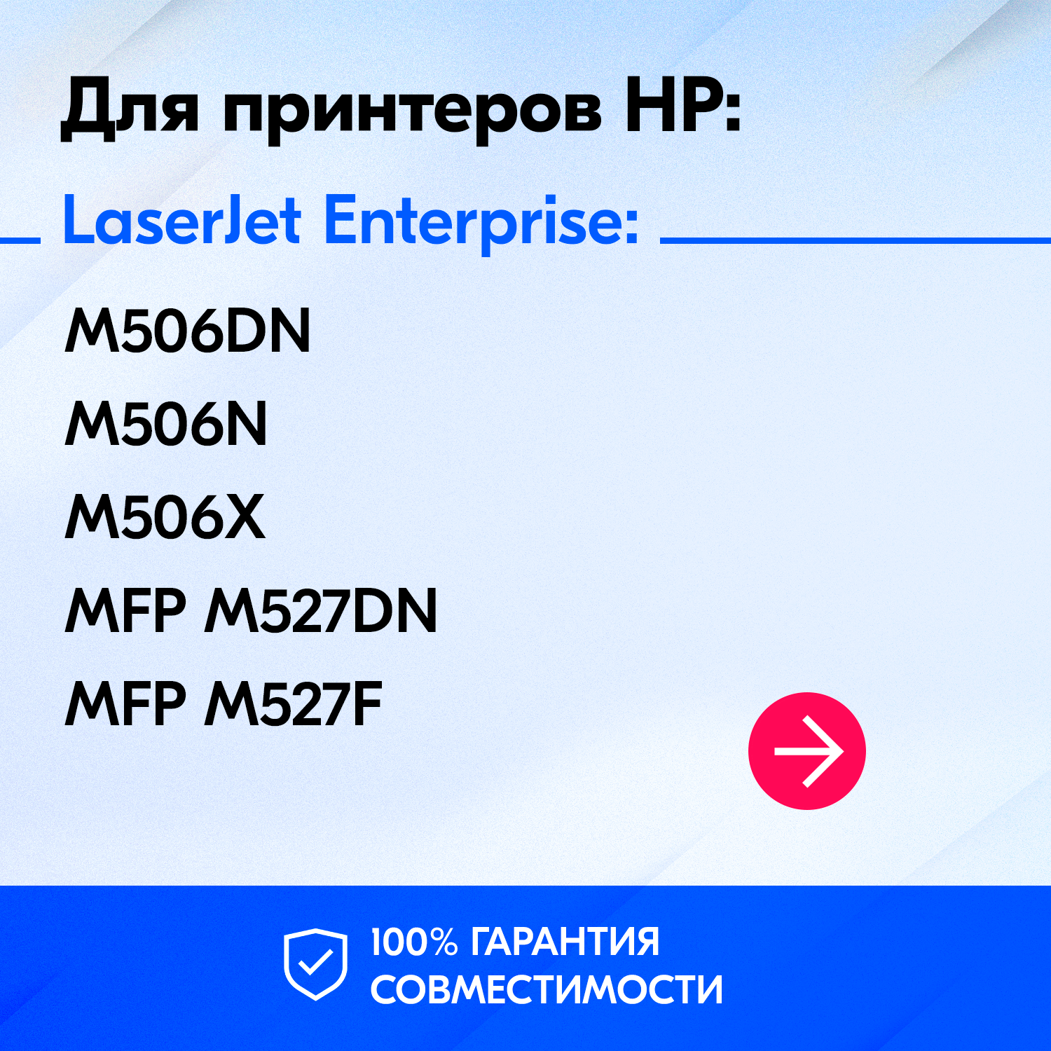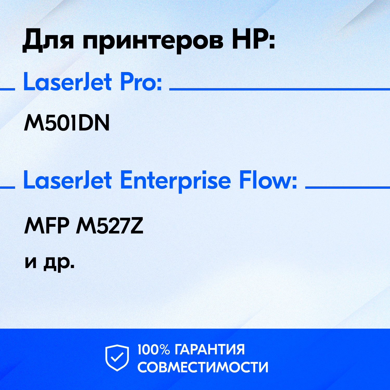 | Модель совместимого принтера | HP LaserJet Enterprise M506dn / HP LaserJet Enterprise M506x / HP LaserJet Enterprise M527c / HP LaserJet Enterprise M527dn / HP LaserJet Enterprise M527f / HP LaserJet Pro M501dn / HP LaserJet Pro M501n |