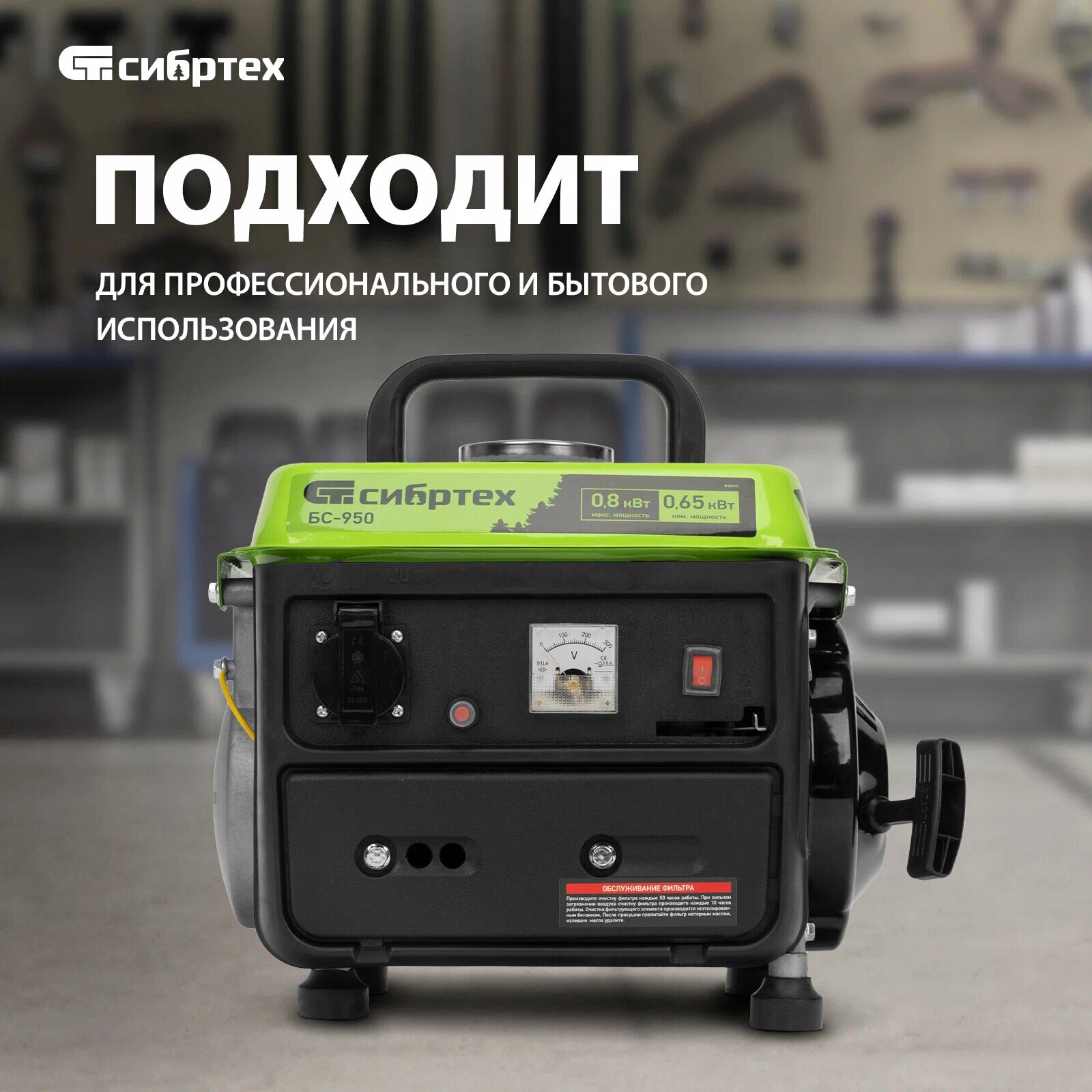 Генератор бензиновый БС-950, 0,8 кВт, 230 В, 2-х тактный, 4 л СИБРТЕХ 94665