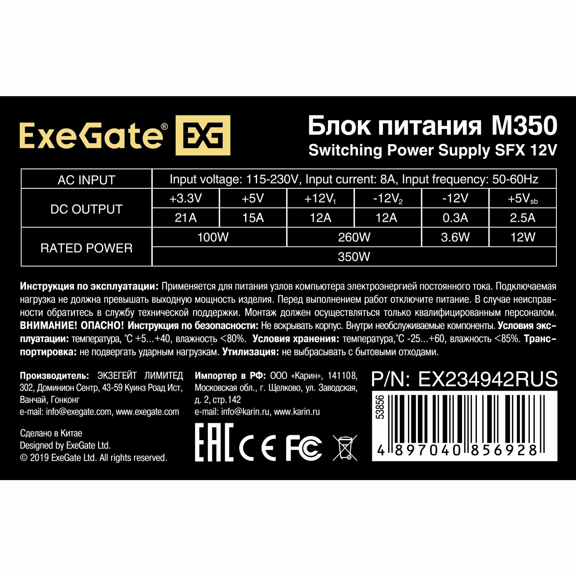 EX234942RUS, Блок питания 350W ExeGate M350 (SFX, 8cm fan, 24pin, (4+4)pin, PCI-E, 3xSATA, 2xIDE, black)