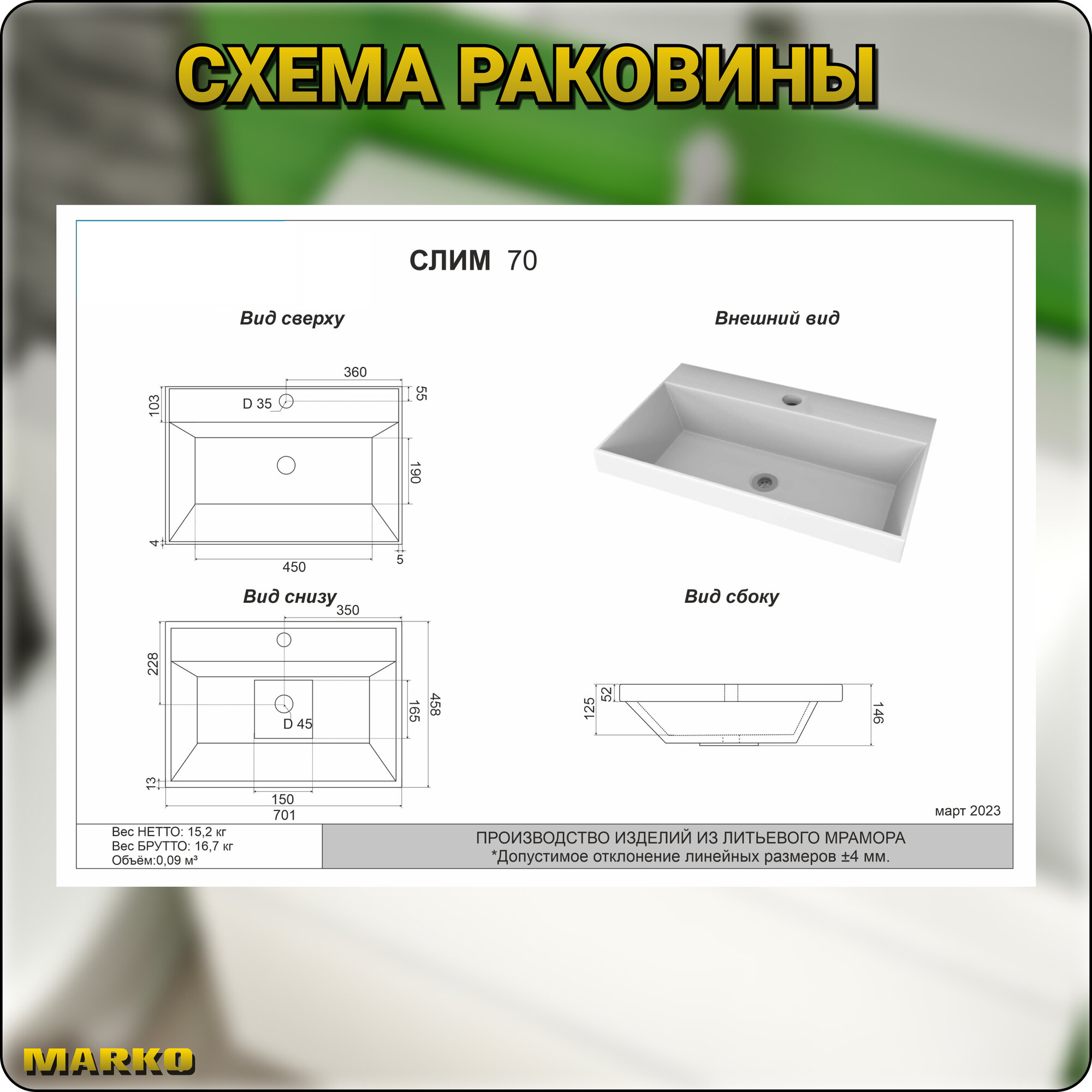 Раковина Марко мебельная Слим 700
